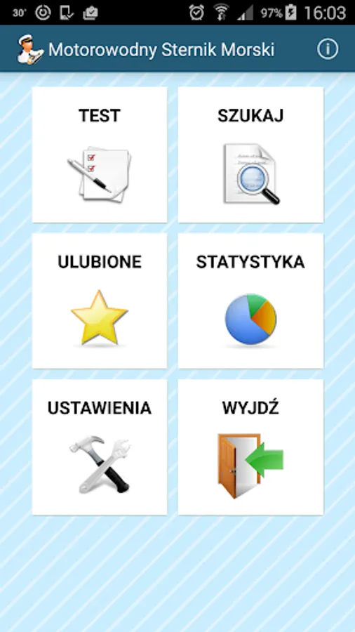 The application includes Copyright © tests help sentence the state exam for patent Motorboat Helmsman Marine, prepared by a team of yacht sailors, skippers, enthusiasts of boats, yachts, sailing boats, personal watercraft, general sailing and power boat.
