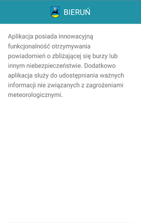 The application is used for sharing by the City Council in Bieruń important messages and information warning of, eg. Meteorological hazards, difficulties in communication, failure, extraordinary events and crisis management. You got COMMUNICATION? TELL OTHERS. Safety is a shared responsibility.