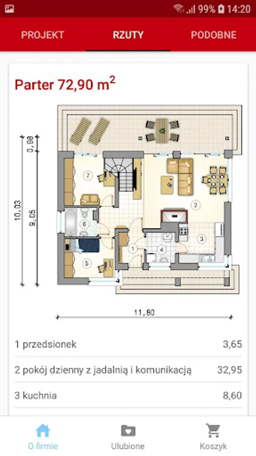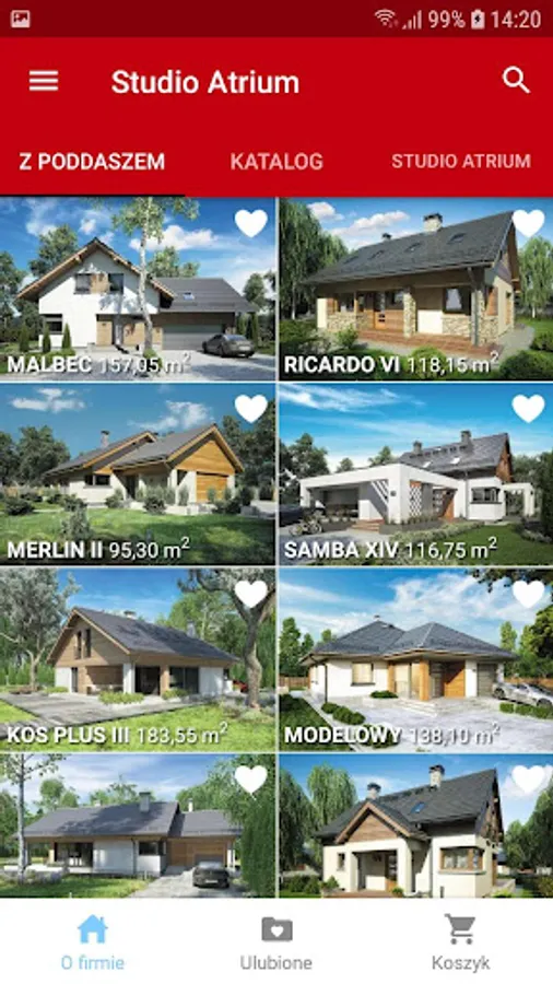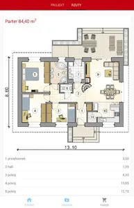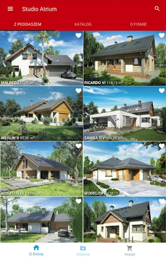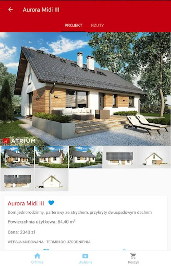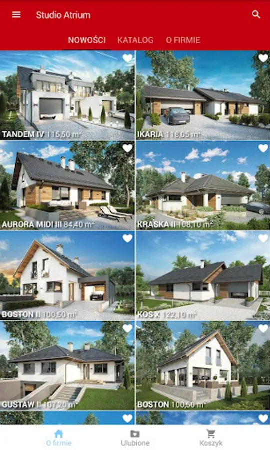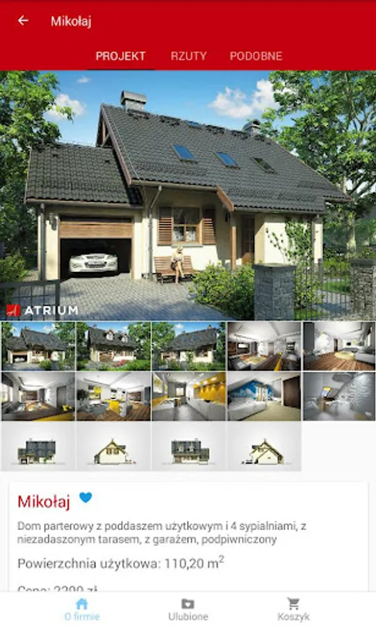 An application presenting the designs of the houses of the Studio Atrium studio. Project visualizations, views, technical data, forum. Selected projects can be purchased through the application.