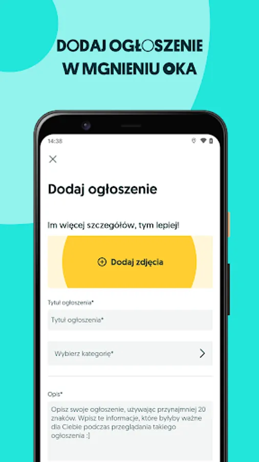 B Add your own ads. Take photos directly through the application, add a title and description and select a category.