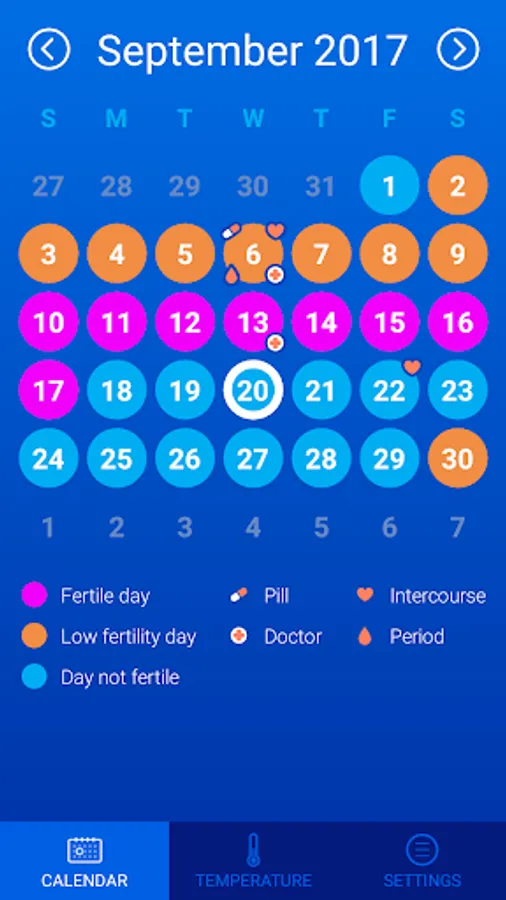 Fertility Calendar tracks and predicts your period, ovulation and fertile window, shows your Pregnancy Chance every day and everything about woman who try to conceive, pregnant or birth control.