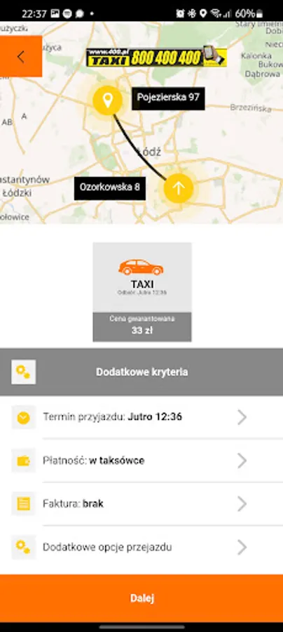 The application allows you to order a taxi in the Taxi 800400400 corporation in the cities of: Łódź, Warsaw, Bełchatów, Radomsko, Kielce. More information at http://400.pl