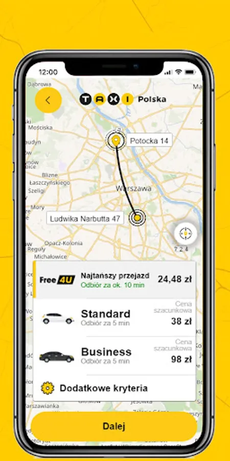 The geolocator will recognize your position, so you can place an order quickly with one click. At any time, you can enter the address manually as well as the usual name of the place where the course starts, e.g. Warsaw Airport, Modlin Airport, Warsaw Central Railway Station, Warszawa Zachodni Railway Station, Warszawa Wschodni Railway Station, Warszawa Shopping Mall, Warszawa Cinema, Warszawa Club and others.