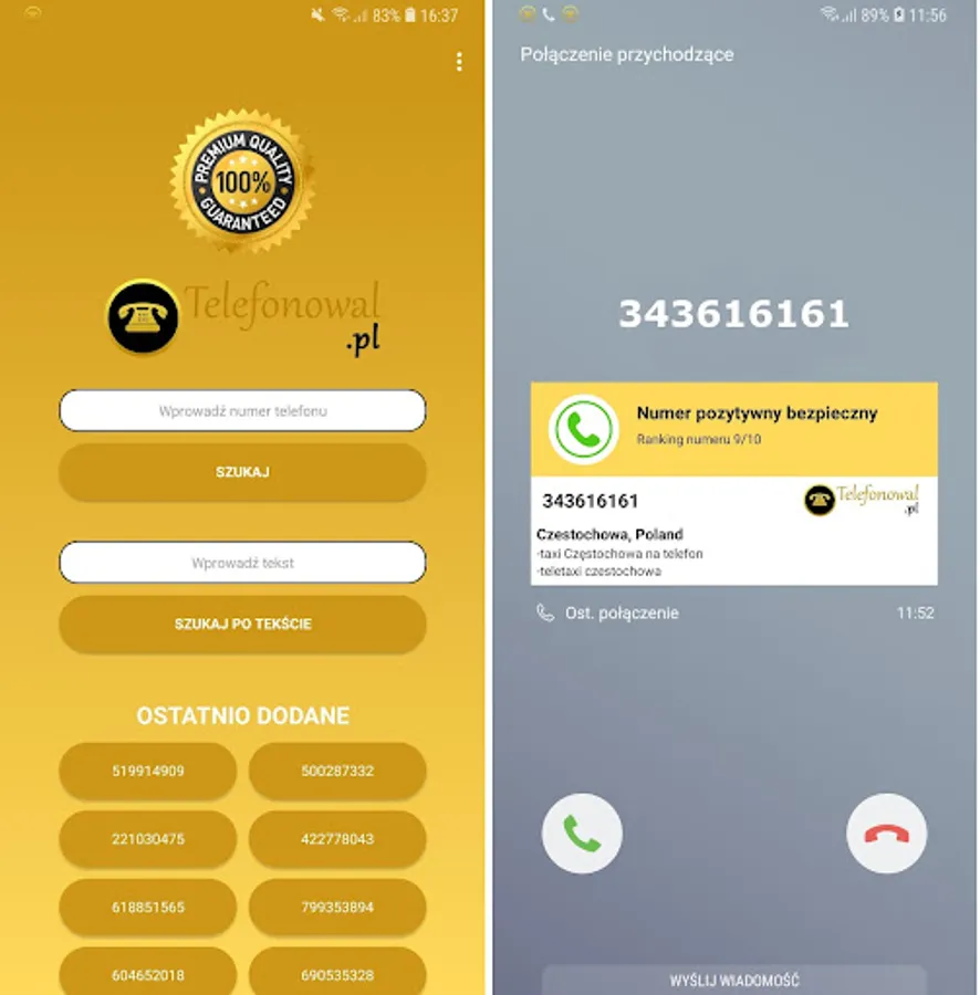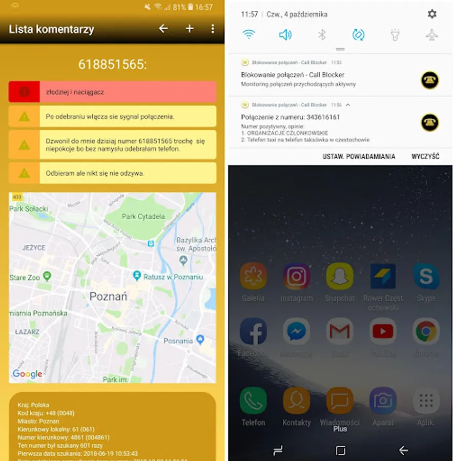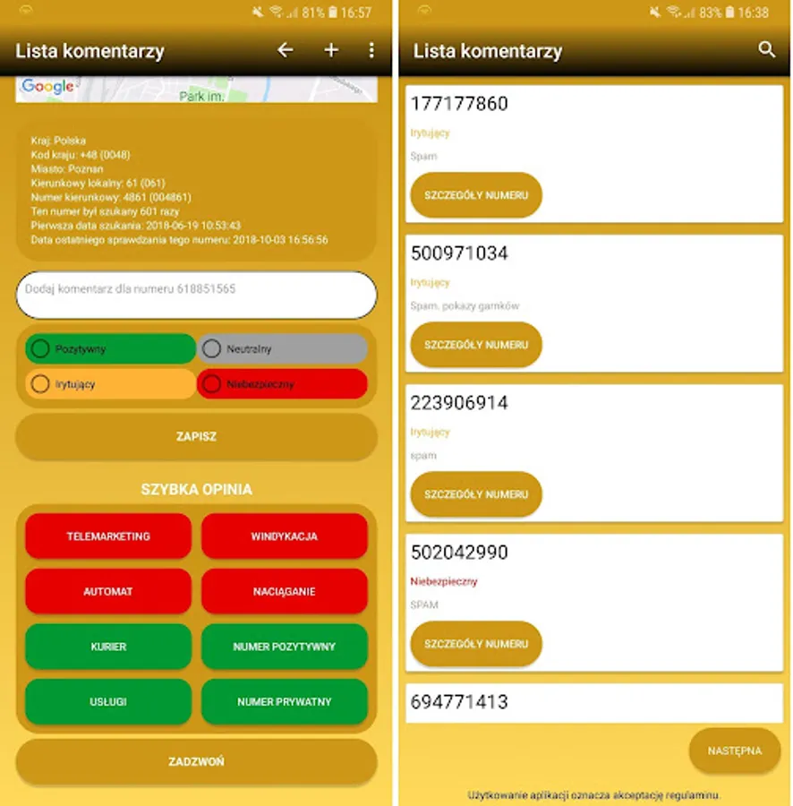 Debt collection? Questionnaire? Telemarketing? Advertisement? Office? An invitation to sell bed linen? Or maybe an attempt to scam data or a dangerous and expensive connection sometimes costing hundreds of zlotys? With our application you will be safe, from now on you will know who is calling you. During the call a number ranking from 1 to 10 will be displayed (warning about dangerous numbers, which have negative opinions and ratings) and the other users of our application selected by the system will be displayed. In addition, after the connection will be displayed information in the android notification menu, who called you and in what matters (eg X telemarketing, advertising, vending machine, debt collection, bank, insurance, office, lawyer ...). After clicking on the notification, the application will open showing the location of the number on the map, statistics, additional opinions and information on the given telephone number. You can also easily add additional options to this or that telephone number that called you. You can also check any phone number in our application at any time and add a new phone number which is not yet available in our database.