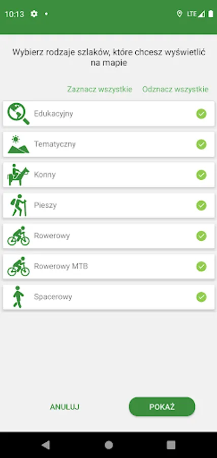 The mobile application allows you to view various types of routes on the map in the Świętokrzyskie Voivodeship. It gives you access to a lot of useful information. The application will display to the tourist the altitude profile, the color of marking in the field, as well as data on the length of the trail and the distance of other trails or objects from the user's current location. All trails available in the application have been marked collectively on the map, with different colors corresponding to the colors of the trail in the field.