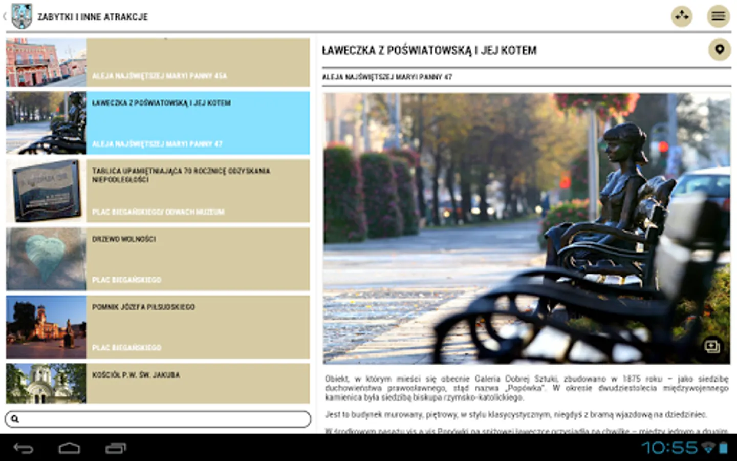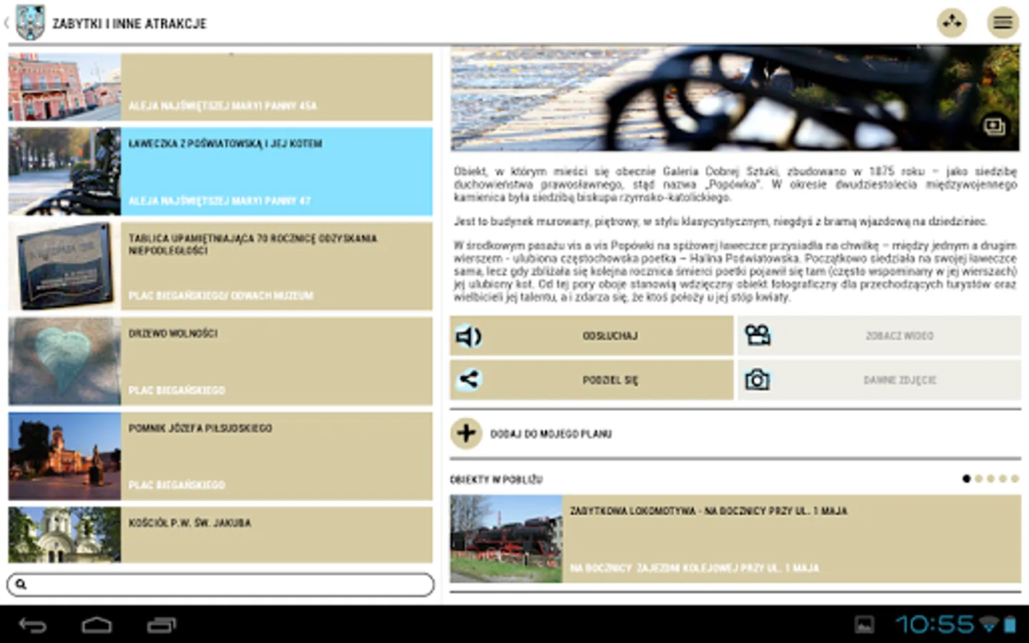 You will find current information about cultural and sporting events, complemented by an audio guide and elements of augmented reality presentation of interesting places, monuments and tourist attractions of Czestochowa, know the offer municipal cultural institutions, as well as find out what offer Czestochova pubs and restaurants. With this application you can easily take advantage of ready-made walking and cycling routes through the most interesting places in the city and surrounding area, as well as the current timetable transport connections with the search engine, which - importantly - also includes any connecting.