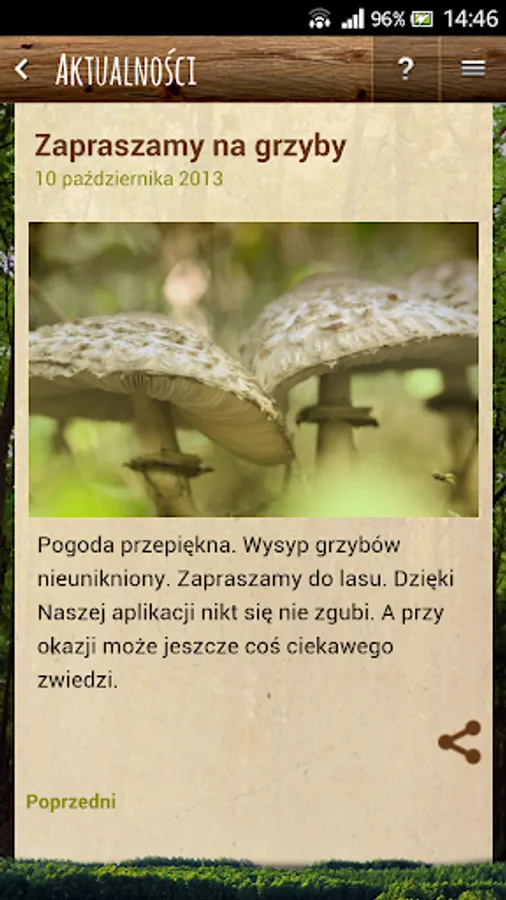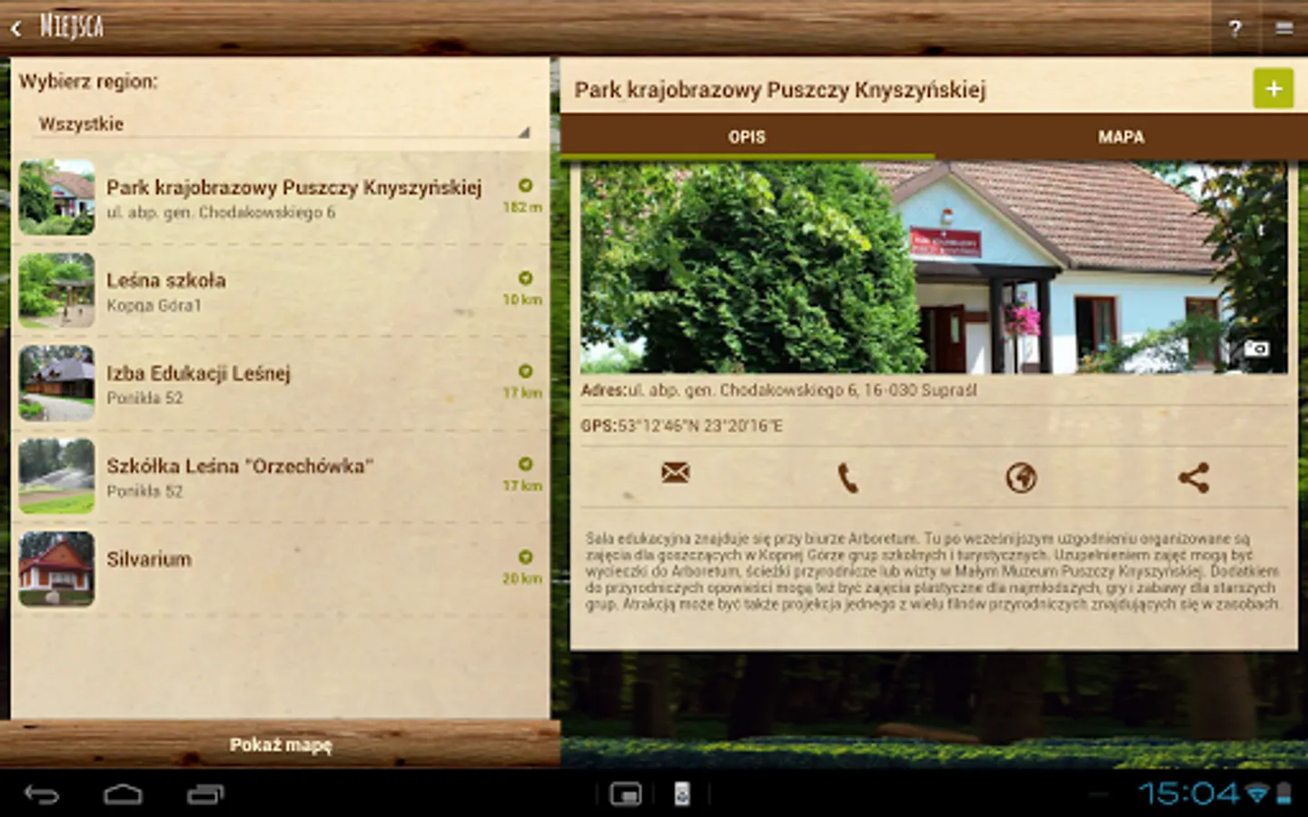The application uses OpenStreetMap maps and GPS, works offline and online. The information contained in the application can also be found on puszczaknyszynska.treespot.pl.