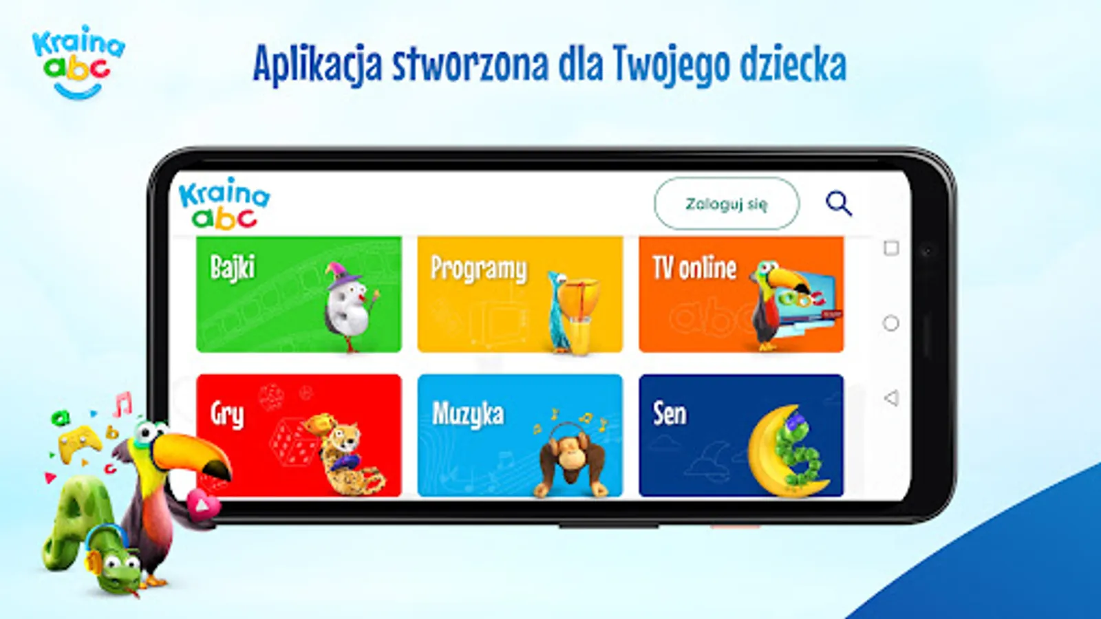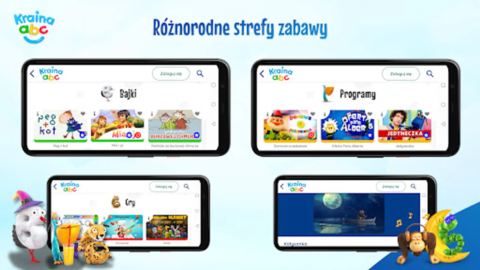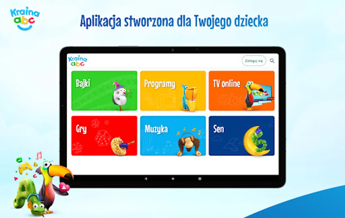 The intuitive interface of Kraina ABC is friendly to the youngest users. The application is divided into six zones: Fairy Tales, Programs, Online TV, Games, Music and Sleep, which allow you to efficiently navigate through the application and discover new interesting content. The guides in these zones are Literaks known from the TVP ABC antenna, which are represented by letters from the alphabet.