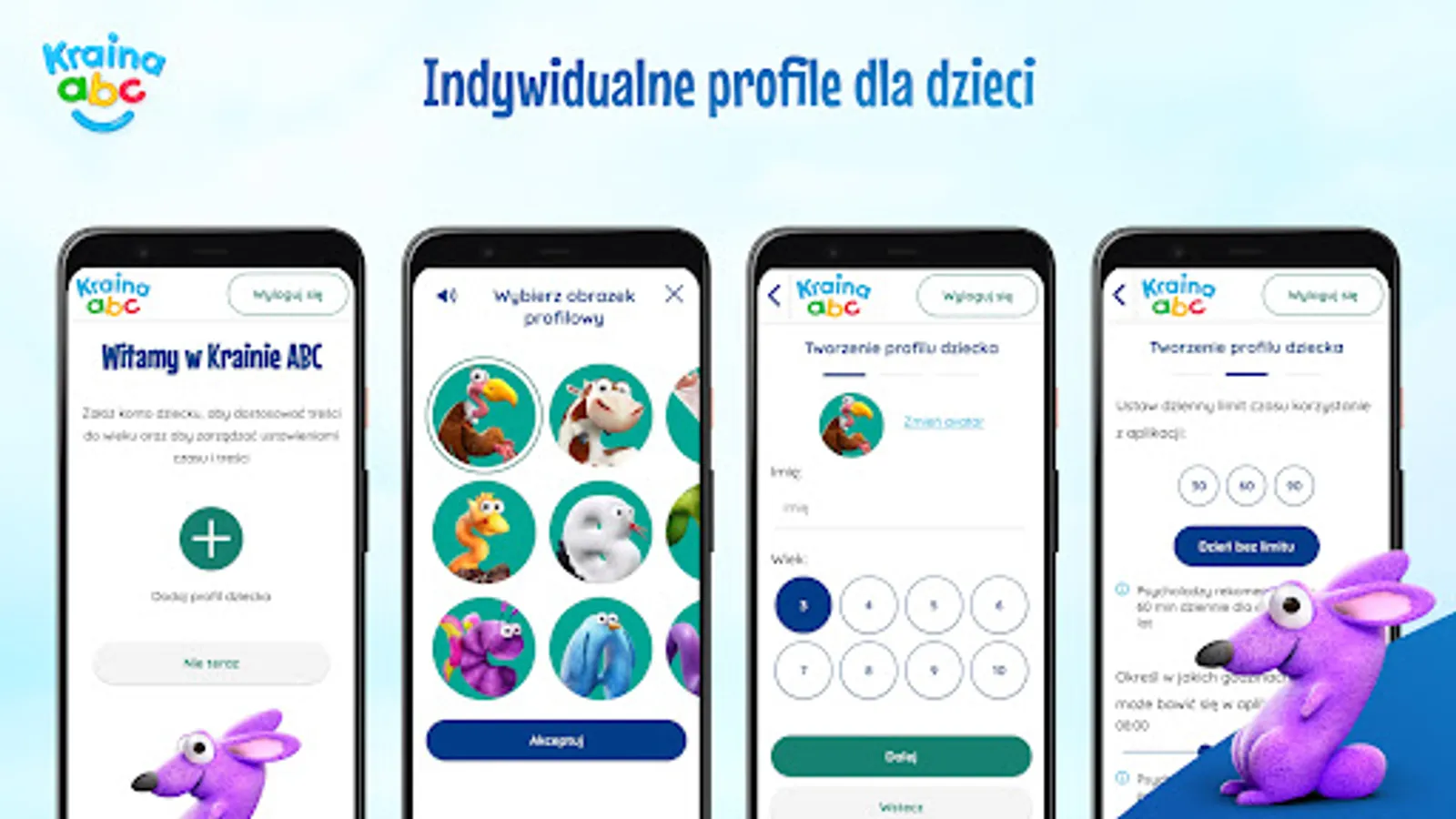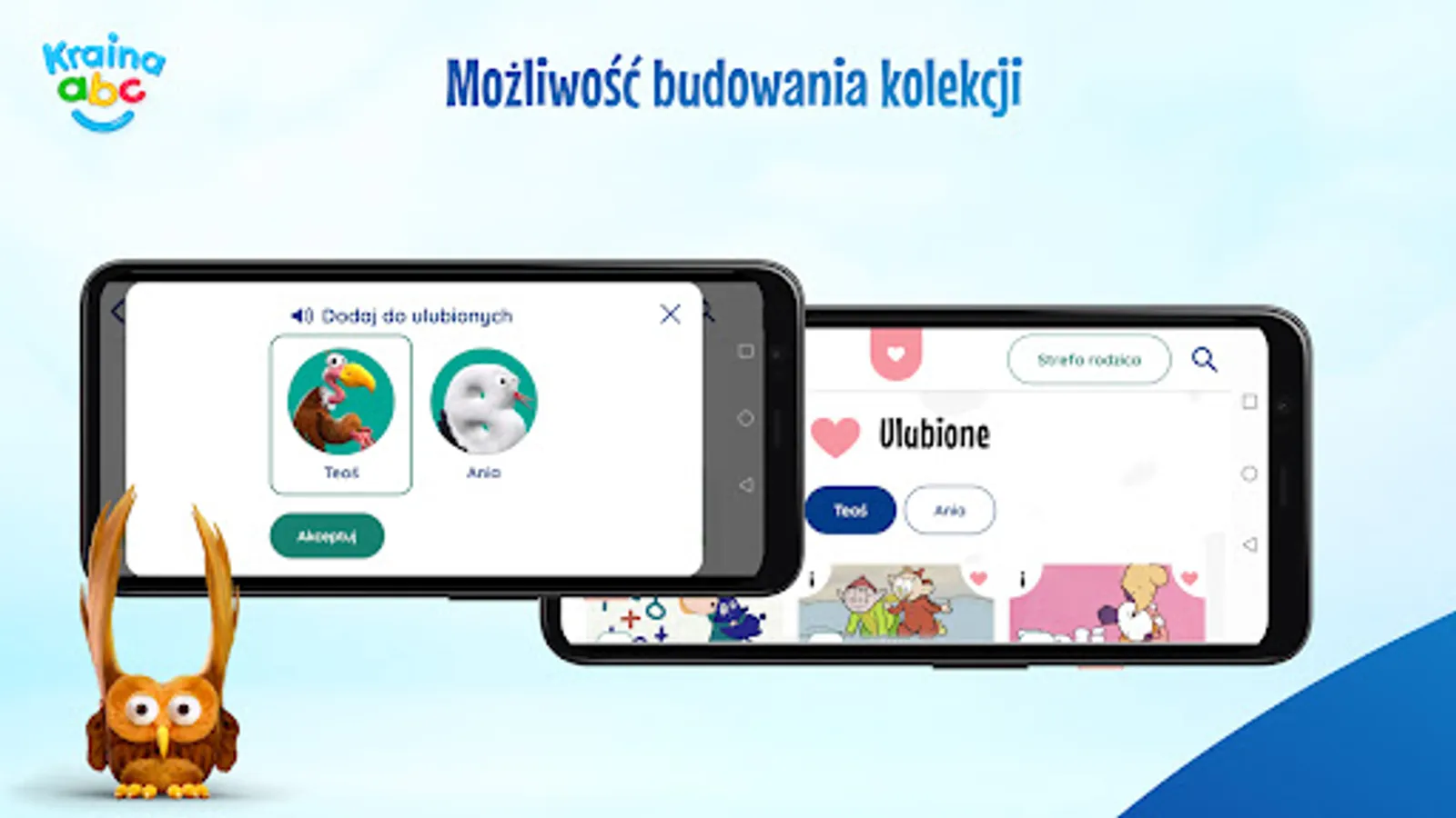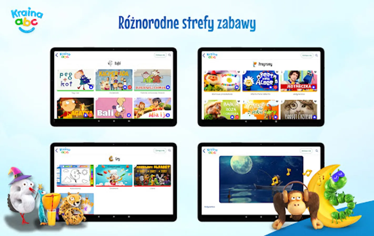 The intuitive interface of Kraina ABC is friendly to the youngest users. The application is divided into six zones: Fairy Tales, Programs, Online TV, Games, Music and Sleep, which allow you to efficiently navigate through the application and discover new interesting content. The guides in these zones are Literaks known from the TVP ABC antenna, which are represented by letters from the alphabet.