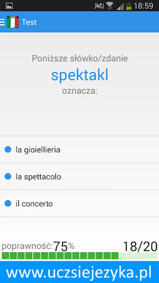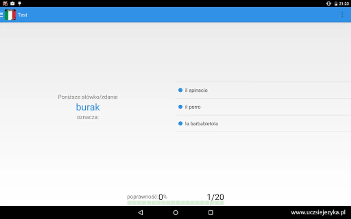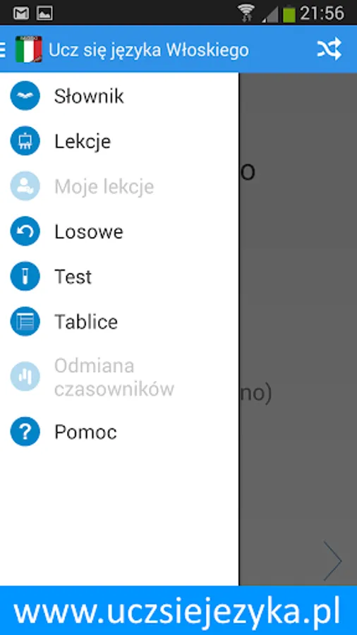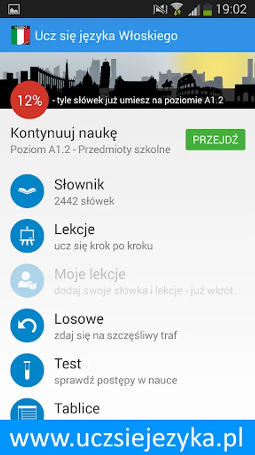 Phrases are categorized in classes and tests, which allow you to learn progressively. The option to hide the initial meaning of the words of the Italian after the Polish helps in remembering. In addition to learning by the lessons it is possible to draw words. Italian words can be read by the teacher.