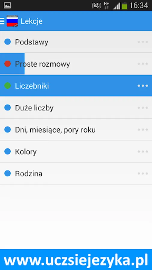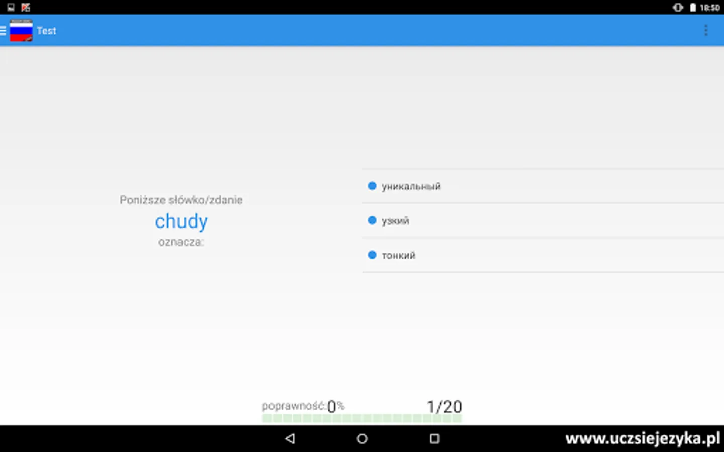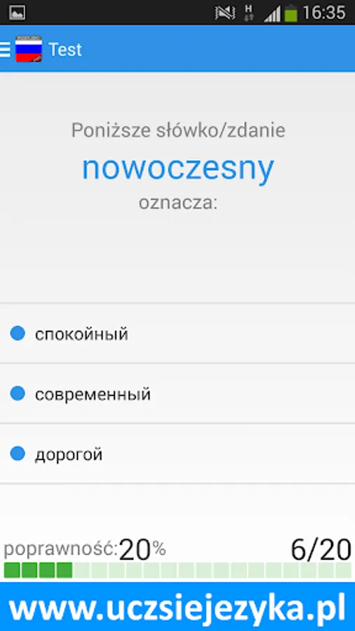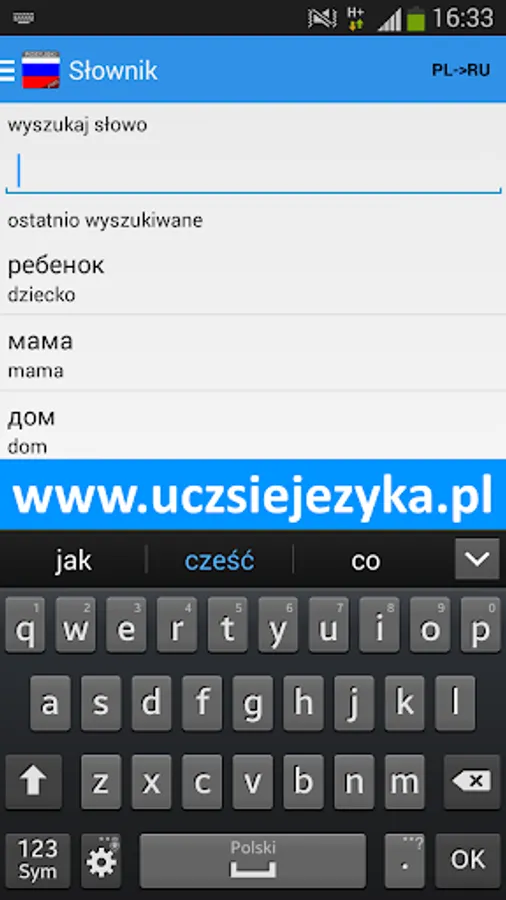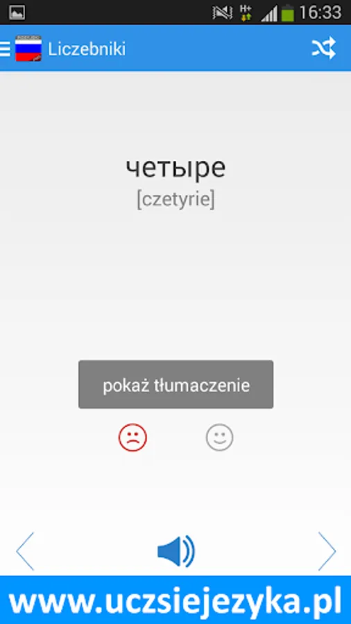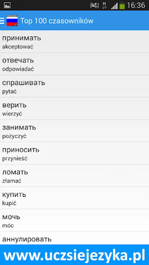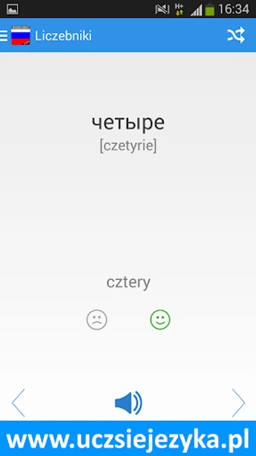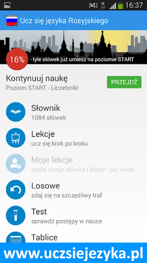 Phrases are categorized in classes and tests, which allow you to learn progressively. The option to hide the initial meaning of the words of Russian in Polish helps in remembering. In addition to learning by the lessons it is possible to draw words. Russian words can be read by the teacher.