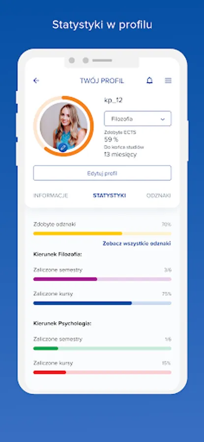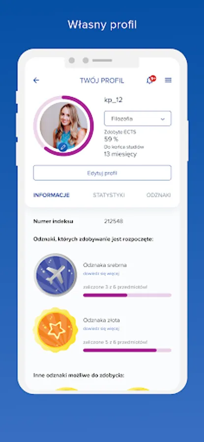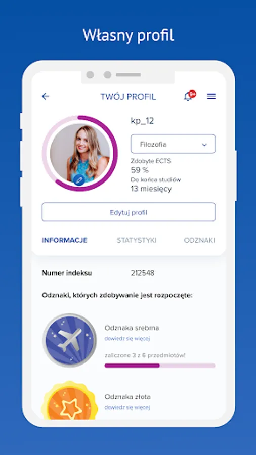 Profile: This module contains basic information about the student, downloaded from the USOS system. In this module, you can change your name to a nickname and set a profile picture. The module shows your current academic stage in the progress bar, the percentage of ECTS credits earned and the number of months left to complete the degree. This module also includes statistics on passed semesters and courses, as well as badges earned.