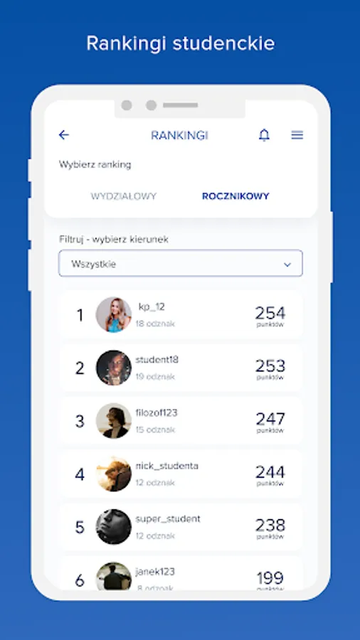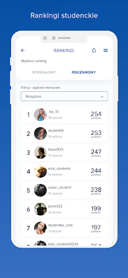 Rankings: Students can see their position against other app users according to the number of badges and points earned. A faculty and yearbook ranking view is available in the app.