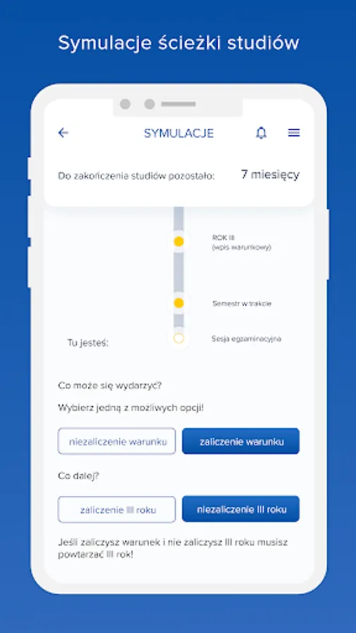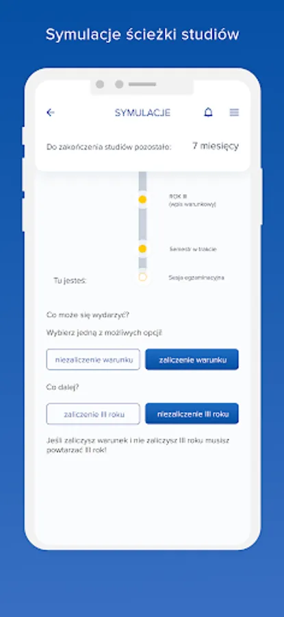 Simulations: The module analyses different study options with suggestions on what documents need to be submitted and by what deadline to graduate. The simulations show students where they are and the available options. Once a specific path has been selected, a message appears regarding the consequences of the decision.