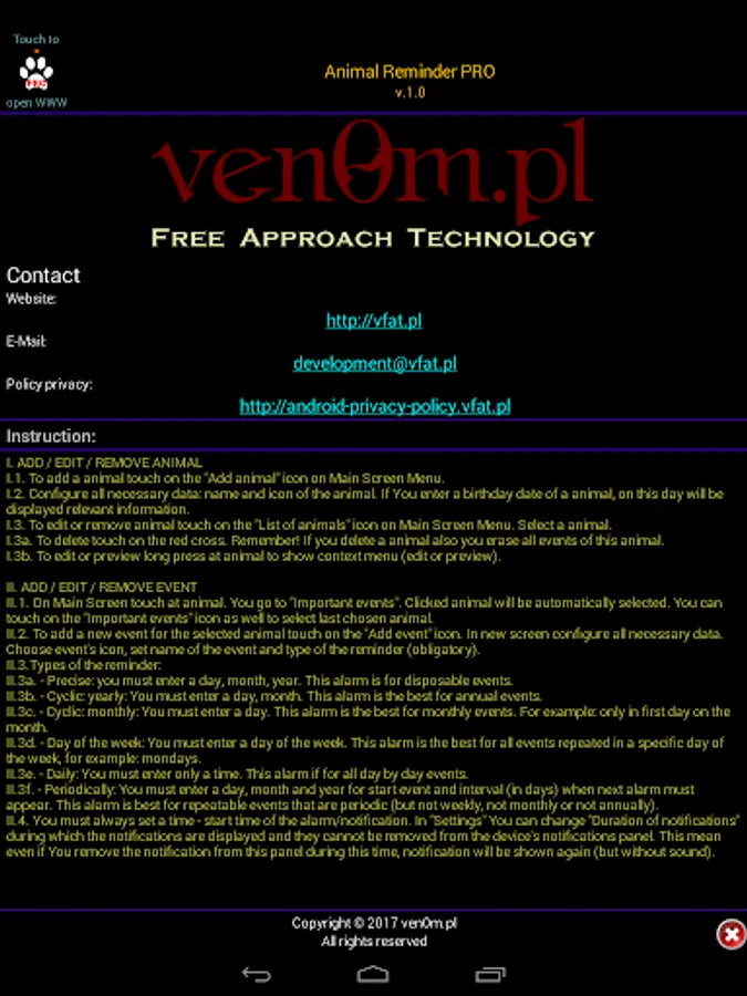 Animal Reminder is primarily used to store all important events (regular and special) related to your pet (but not only) in one place - on your mobile device, instead in your head.