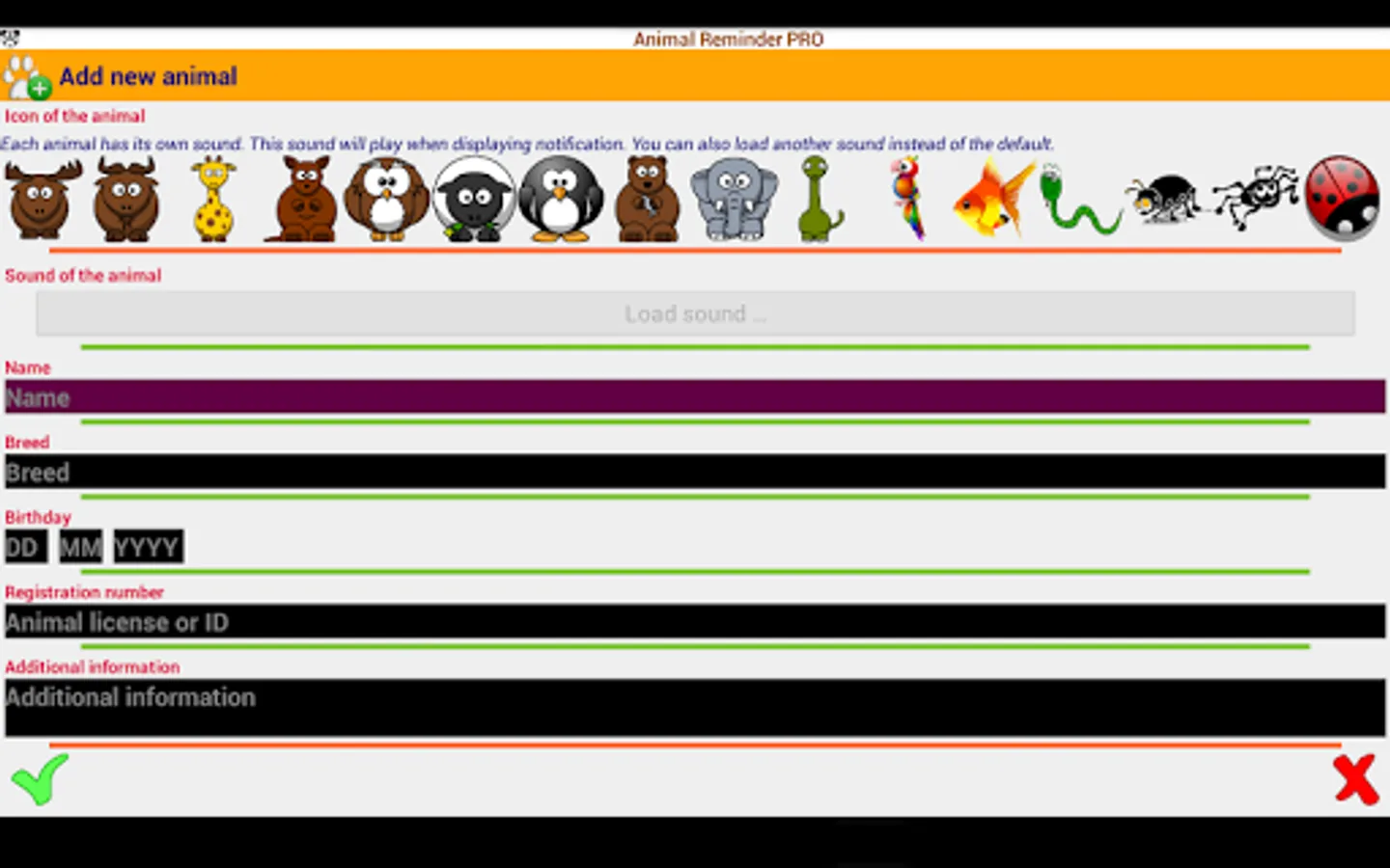 Reminders will be displayed at the specified time as system notifications, during which a sound will be played for the selected animal or another user defined. So you do not have to worry about forgetting about a cyclic or one-off event, because the app will not let you forget about it.