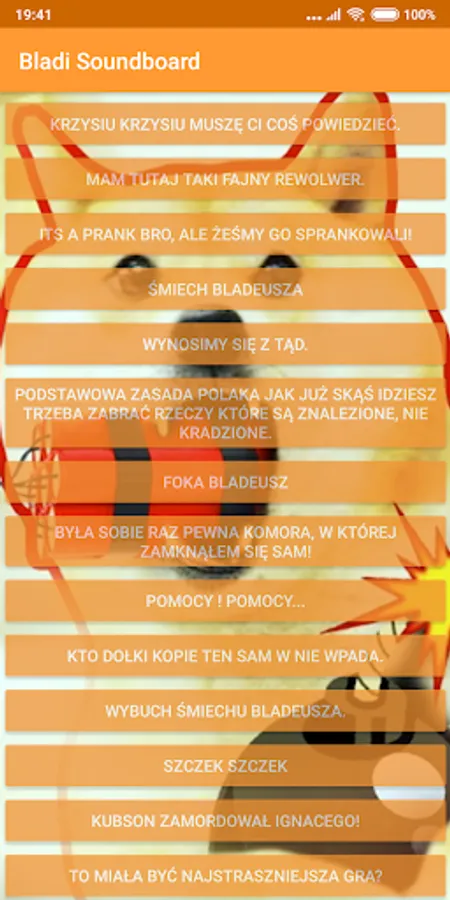 '' No one will ever find a pancake because they will not think where to look for him! Bladeusz is clever. '', 'Update kupsko.' ',' 'Something stinks here and it is not me exceptional.' '' Kubson murdered Ignacy! '' And many other texts. All texts come from the Bladi channel. Laugh with friends and have fun thanks to this Soundboard app.