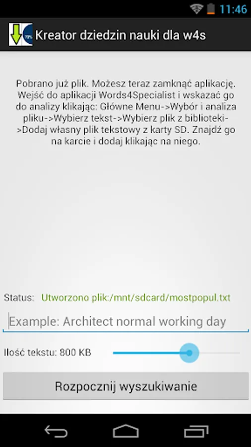 3. You walk into, Menu '-> Selection and analysis of the text -> Select the text -> Select the file from the library Words4Specialist -> 4. Add your own file on the SD card
