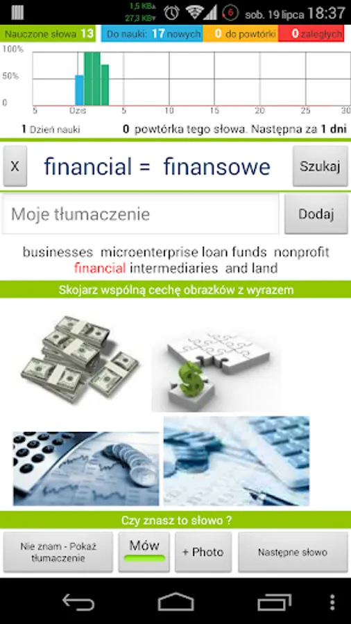 4. Aby lepiej zapamiętać, każde słówko wypowiadane jest po angielsku, mamy zdanie w którym zostało użyte. Możemy dodać własne zdjęcie lub tłumaczenie, które znajdziemy klikając przycisk 'Szukaj'