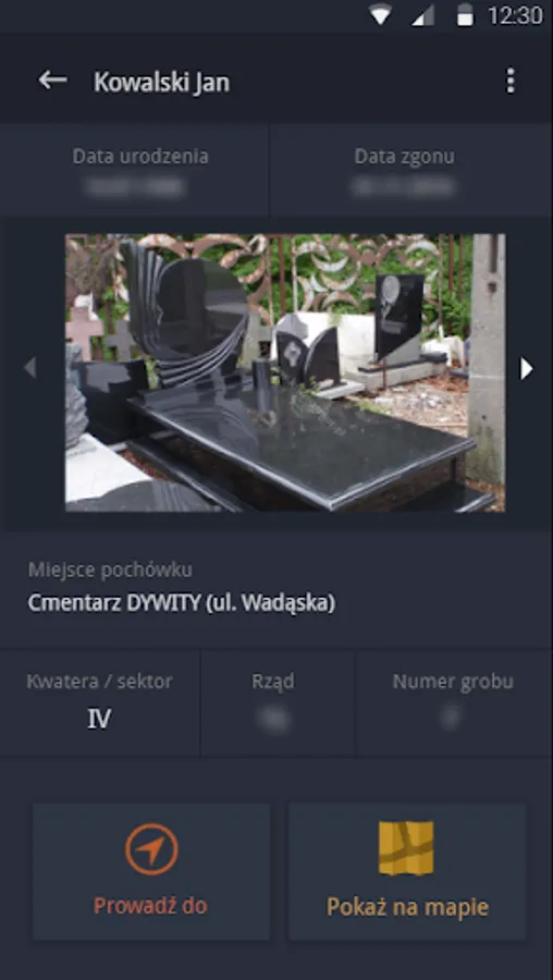 The application helps in locating people buried in Olsztyn Cemeteries Street. Wadąskiej (Dywity) and at ul. transverse