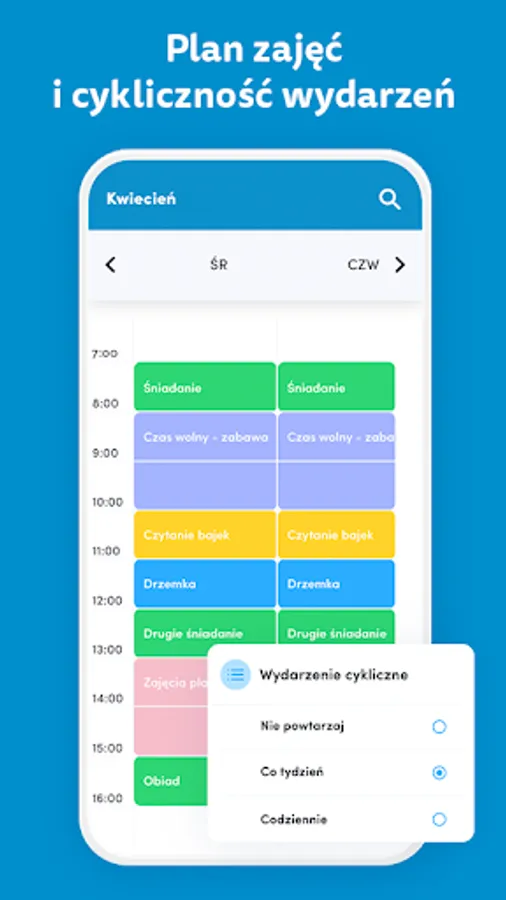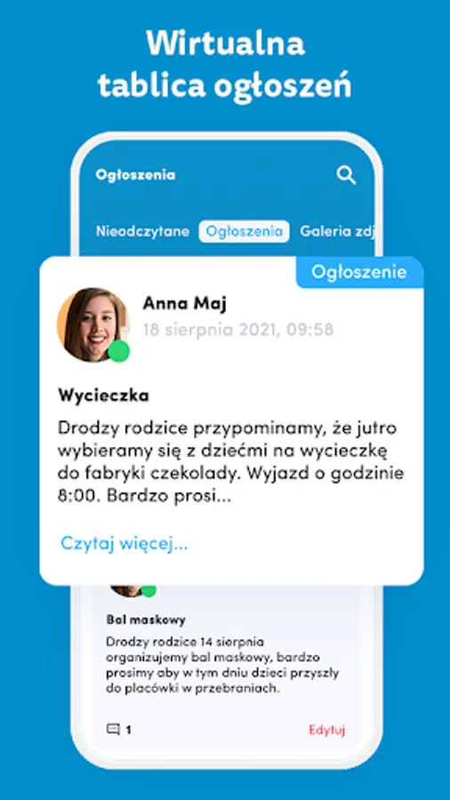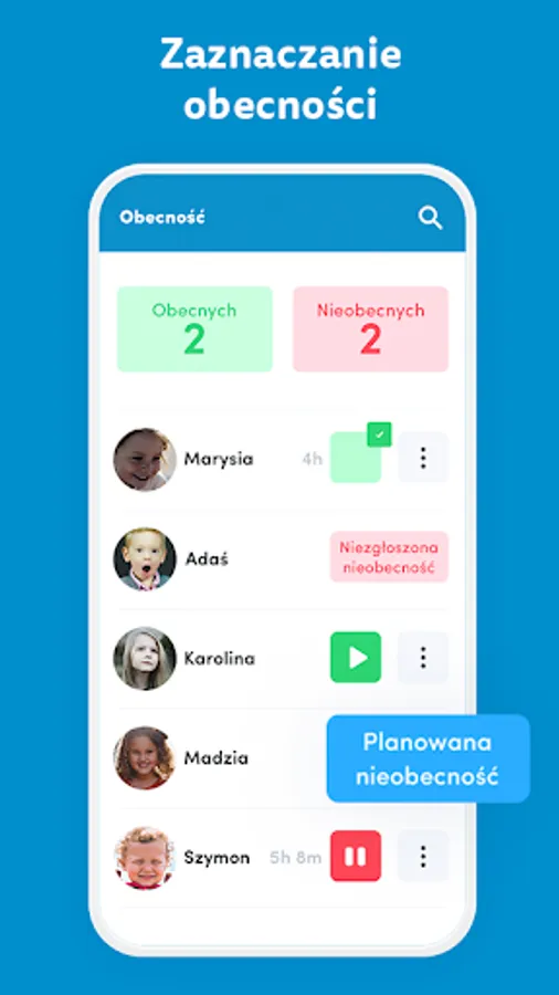 "Warsaw Nurseries" is a mobile application for parents of children attending public nurseries, thanks to which you will always be close to your child. With it, with one click you can report your future absence, see the bulletin board or write a message to your guardian. From now on, you will always have information about your dream, schedule and contact with the facility. All you have to do is activate the application.