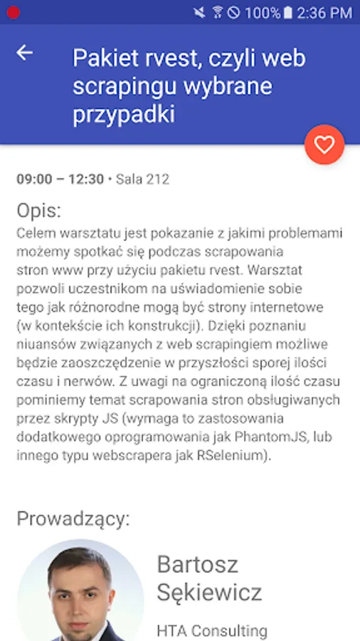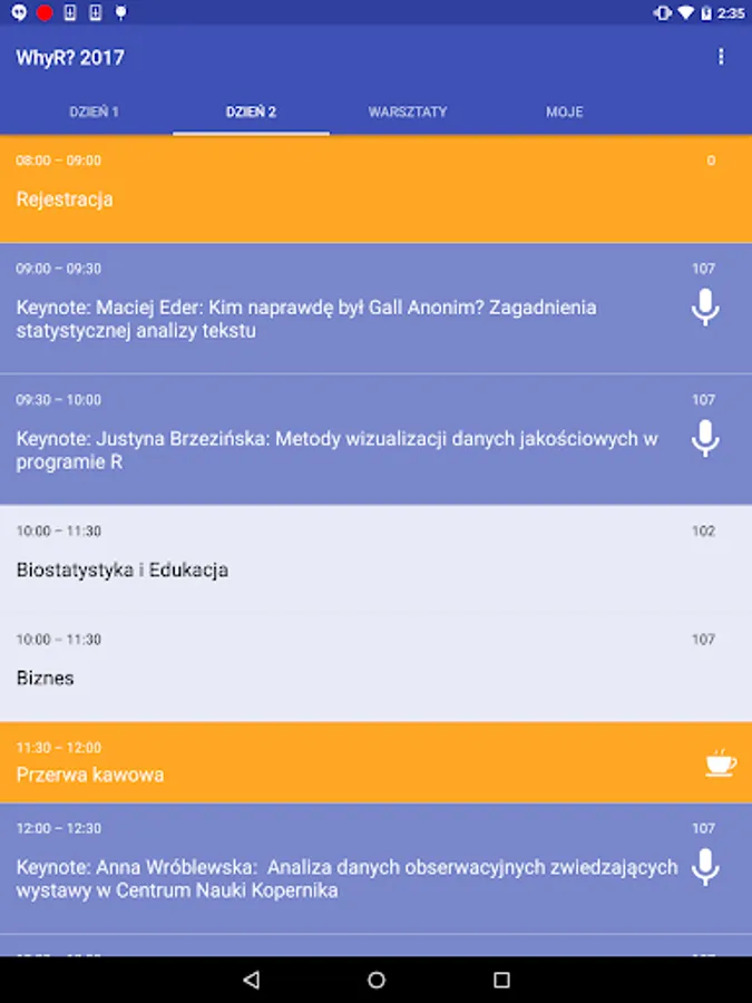 The application includes a detailed plan of workshops and conferences. You can check the description of each point, leading information, time and room where the lecture is held. In addition, it is possible likes the lecture, which then appear in the "MY" containing all your likes lectures - this will allow you to create your own plan conference.