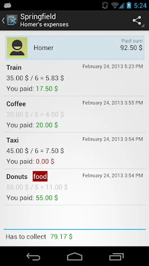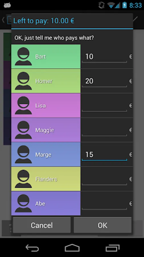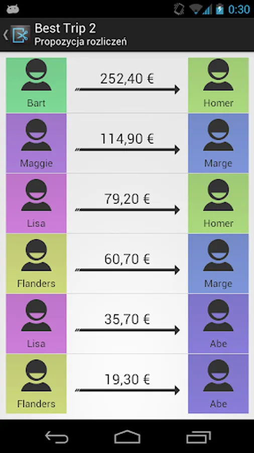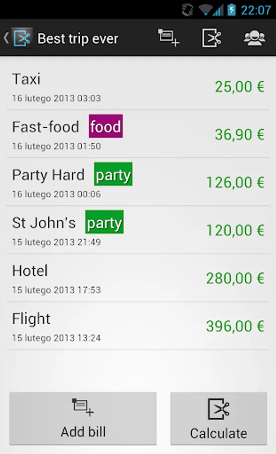 Split It! is an Android app that lets you track expenses during trips, party nights and other events. Just a few clicks and you know who owes what! Works fully offline, so you no need to worry about roaming expenses.