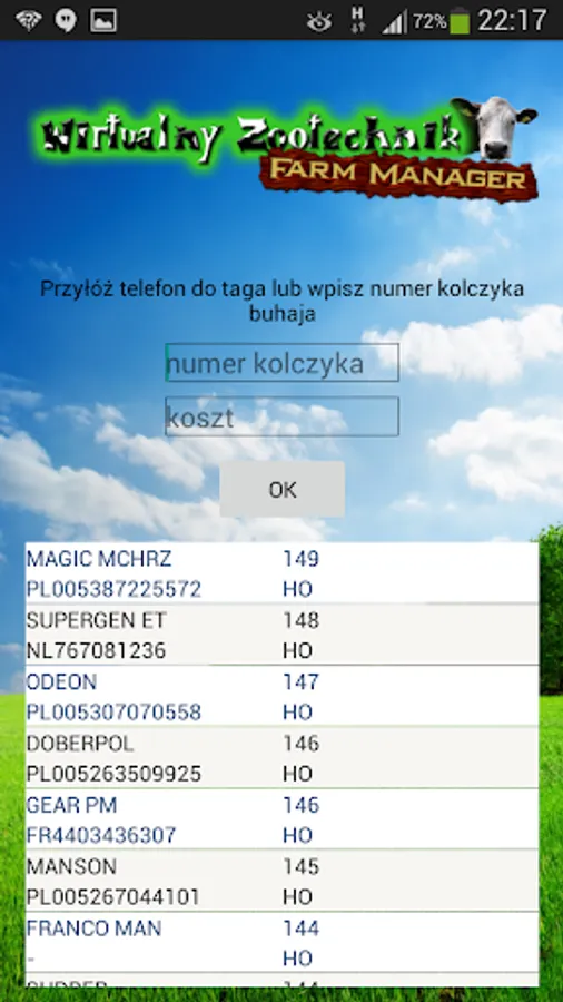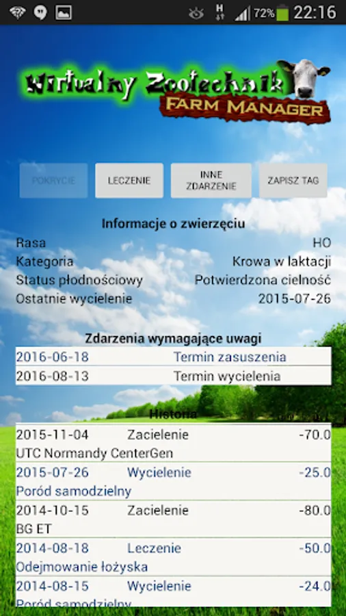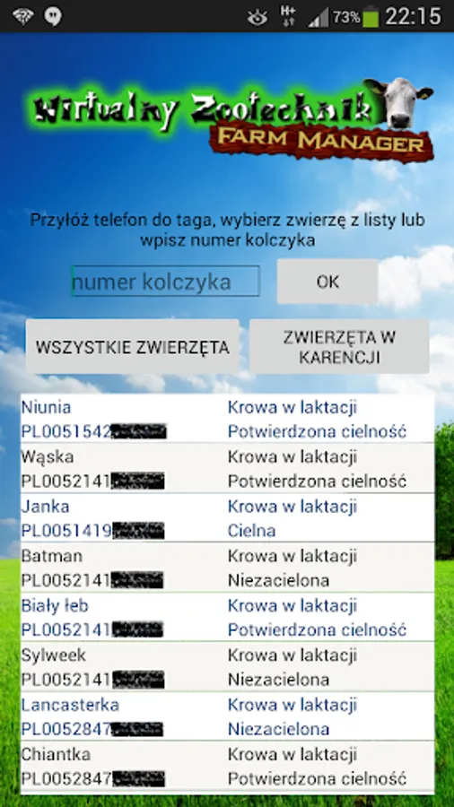 Zootechnik Virtual Farm Manager is an application for managing a herd of cattle. It is an extension of the program online WirtualnyZootechnik.pl and is it fully compatible. Allows the identification of the animals with ear tags (requires phone with NFC reader) displays events requiring attention (eg. The approaching date of calving, the dry etc.). It allows you to quickly browse the herd and the history of all animals. It shows animals from the current grace period for milk / meat. Using the application, we can also make the event (eg. Coverage, treatment etc.). The application has built a widget that displays up to date information requiring attention breeder. Farm Manager for the action requires the purchased accounts in the program WirtualnyZootechnik.pl