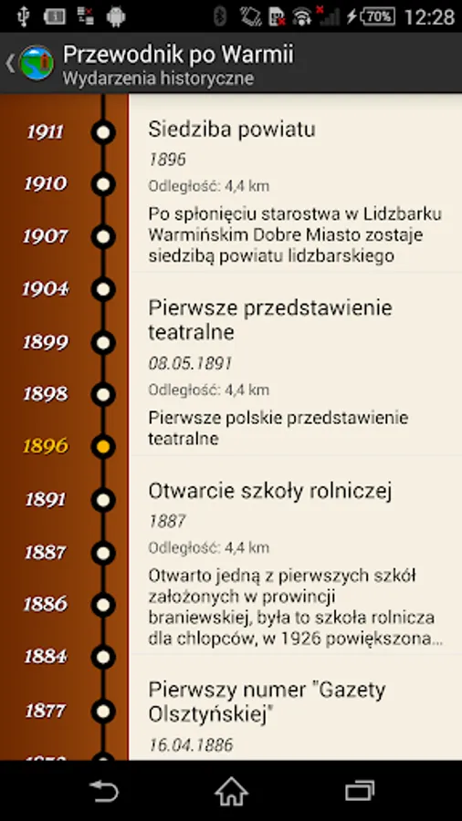 Guide to Warmia consists of six modules: historical events, historical figures, places of interest, active recreation, trade and services and events organized. The application is a true compendium of knowledge about the region where the information is presented in a friendly manner through the use of scrollable timeline, detailed descriptions of the characters, events and objects and maps with navigation. By using geolocation every user can easily find out where the area hosts an interesting event, what you need to do and see and where to eat well and to find accommodation. A major advantage of the application is built-in database of tourist facilities and commercial and service, making it possible to use it without having to connect to the Internet.