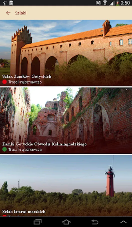 Trails Gothic Castles are 114 selected places of interest and facilities divided into six thematic tourist routes: "Gothic Castles", "Gothic Castles Kaliningrad region", "Trail monuments of hydraulic engineering" "Trail lighthouses", "Amber Road", "Trail Copernican ".