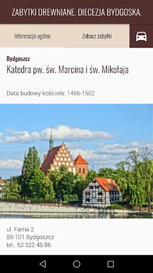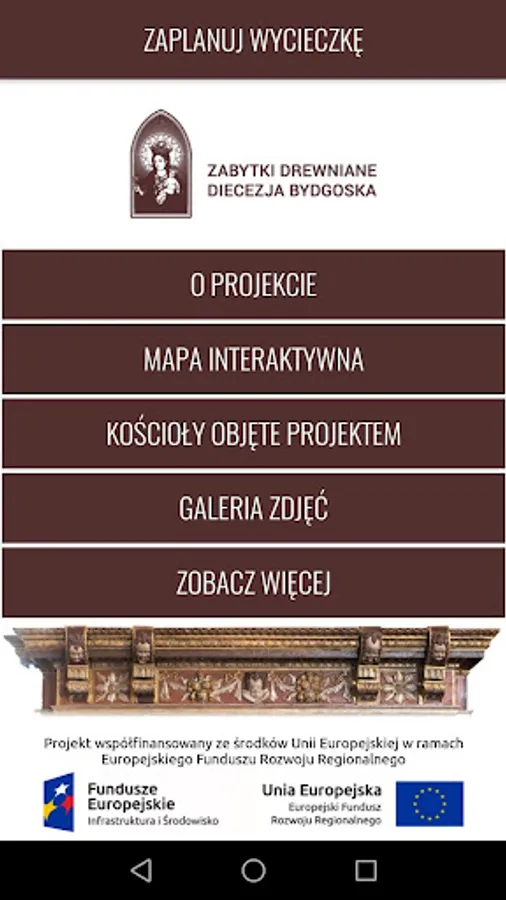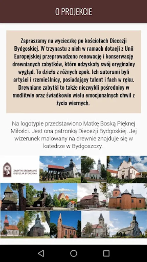 * The application presents a wooden monuments in 13 churches of the Diocese of Bydgoszcz. It contains the necessary tools to organize excursions: map, pictures and descriptions of the most interesting, unusual and extraordinary objects made of wood.