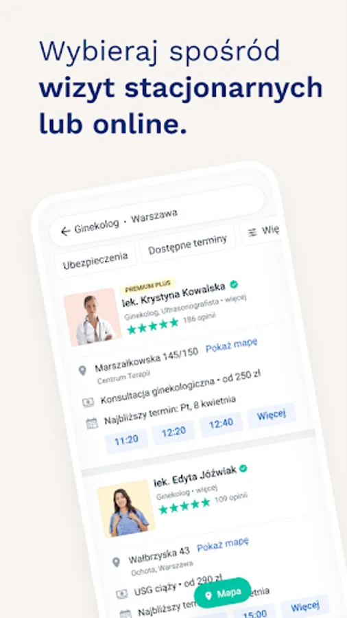 In our application you have access to over 146,000 specialists from all over the country, with whom you can make an appointment from your phone. When searching, you can use filters such as specialization, city, postal code, service, health insurance (Allianz, AXA, Compensa, ERGO Hestia, GENERALI and others) and search directly on the map.
