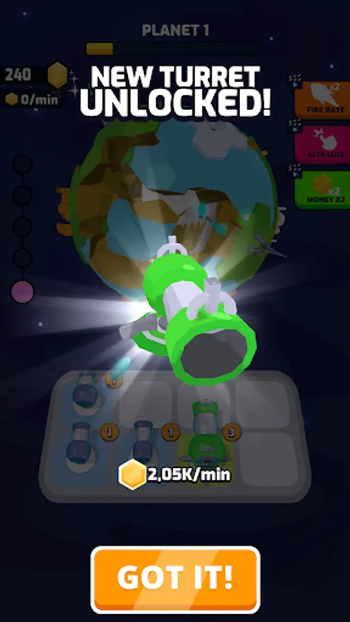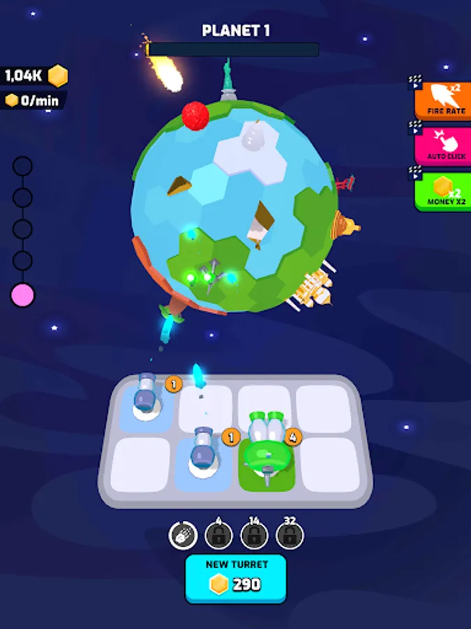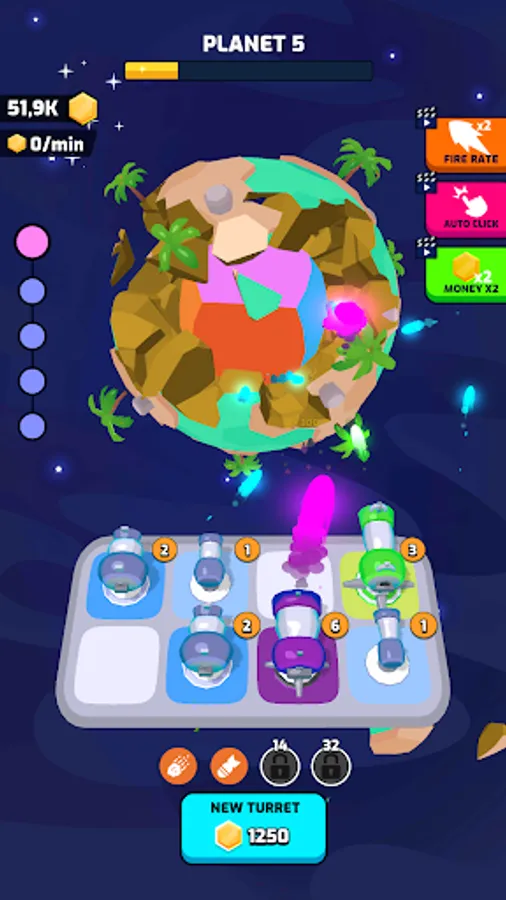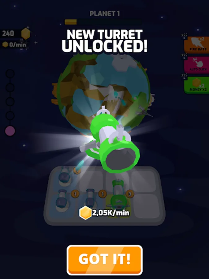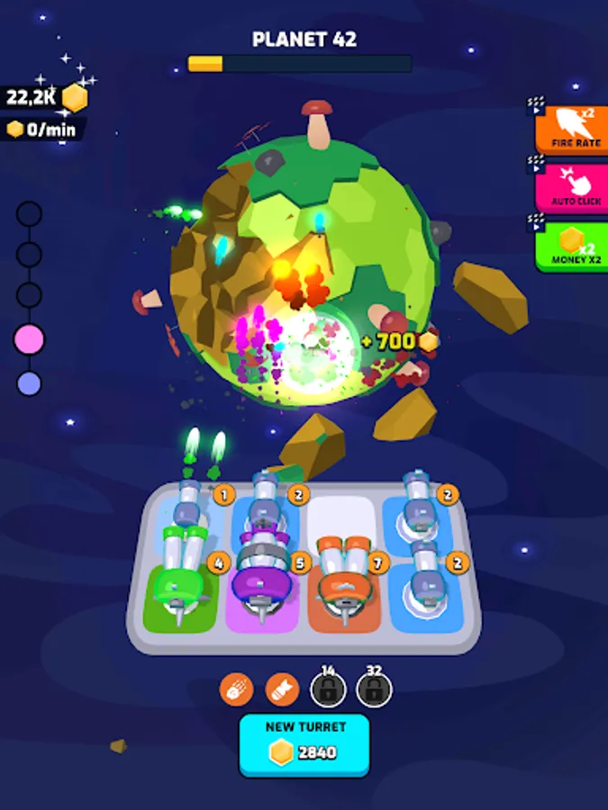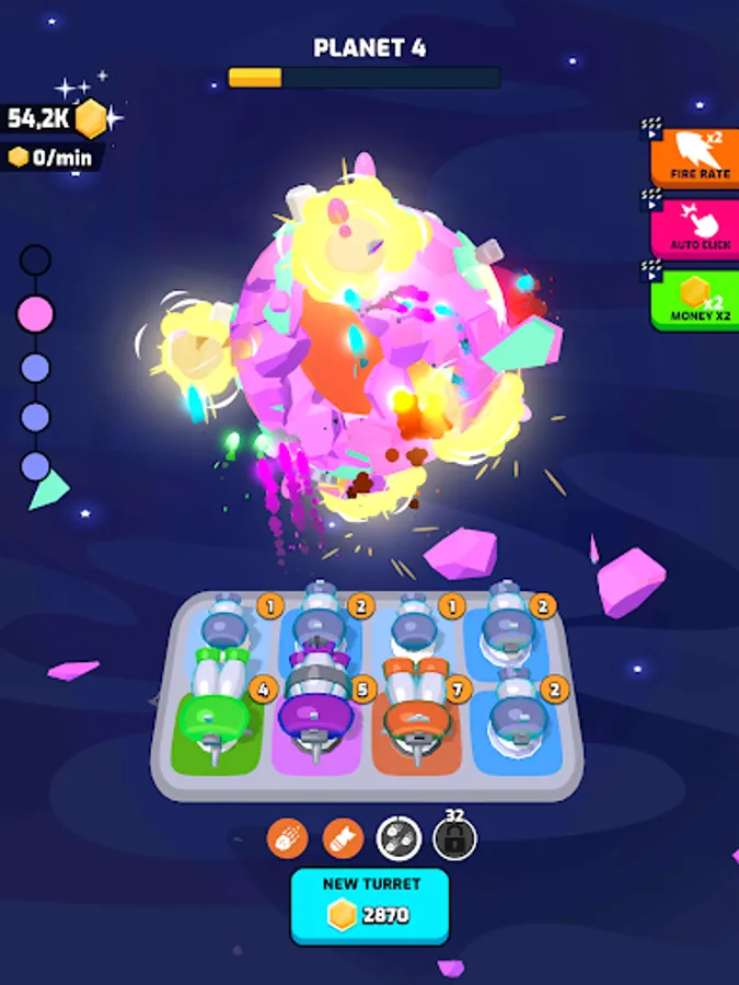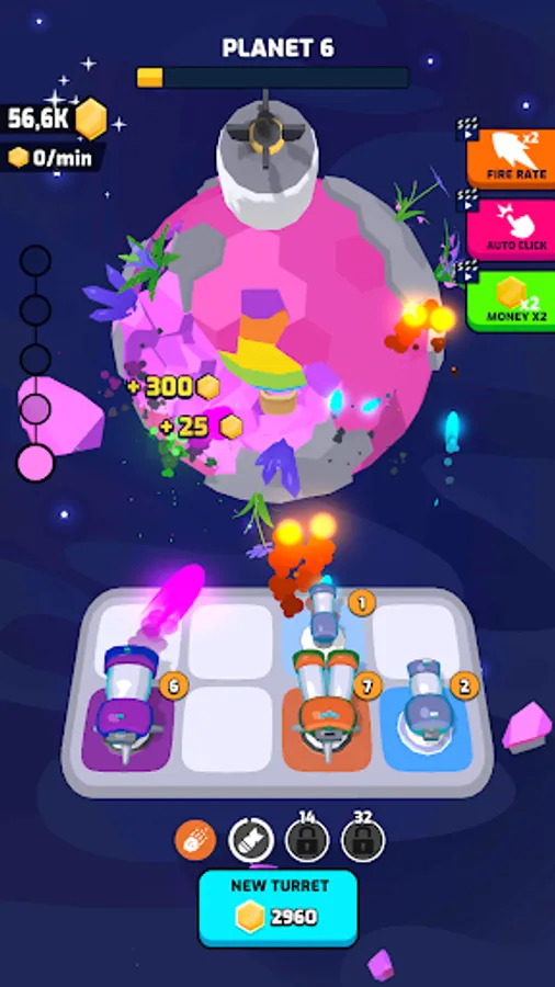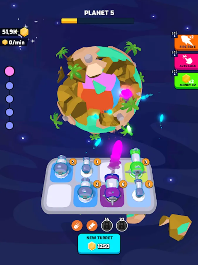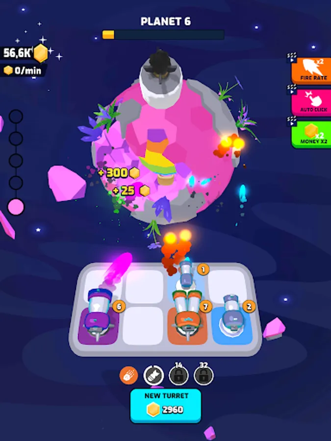 Merge turrets to destroy planets and collect all the hidden treasure of the galaxy !