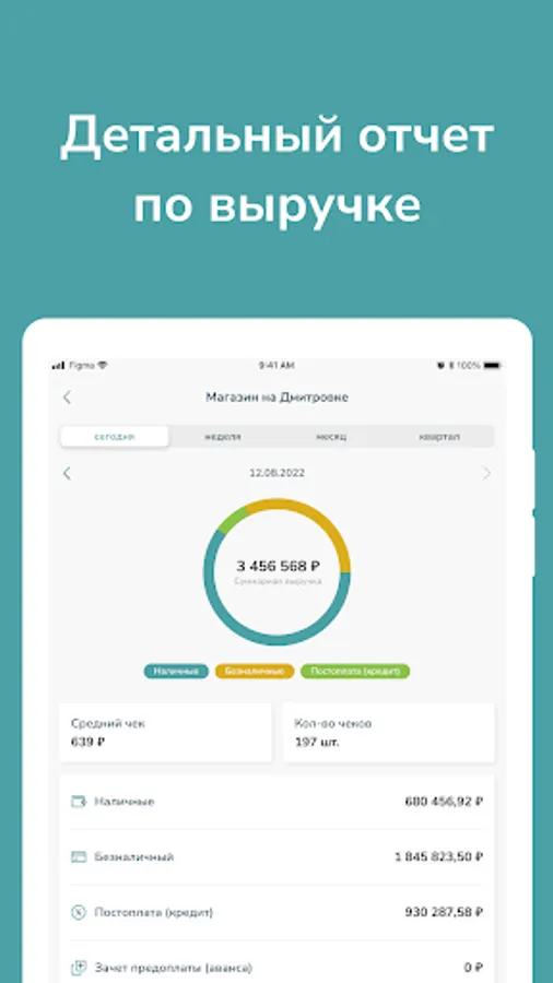 - displaying revenue by types of payments: cash, bank card, advance and credit payments, counter representations;