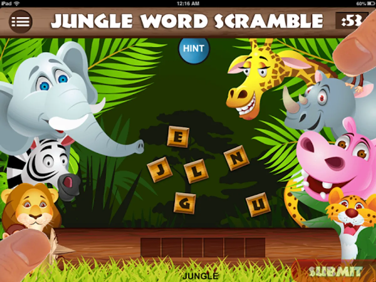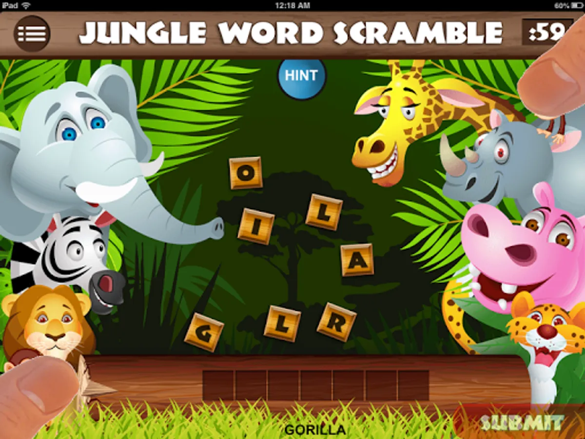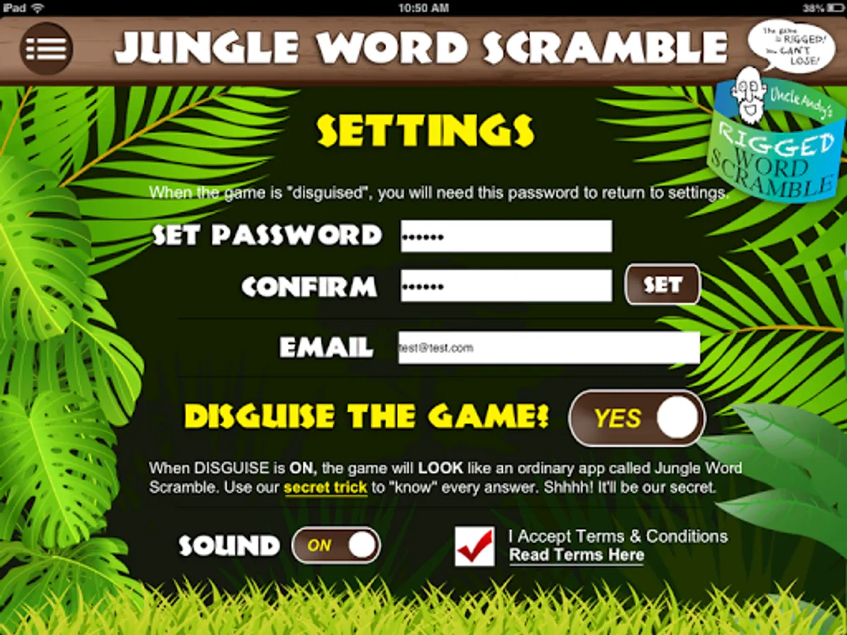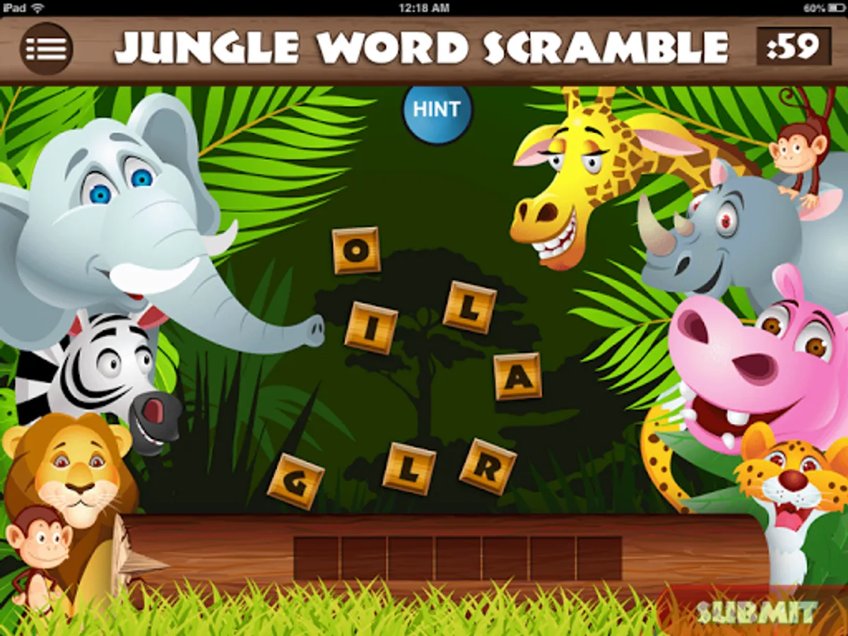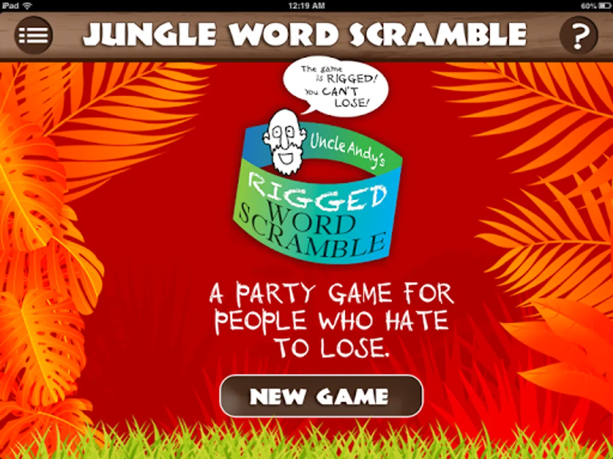 The app will transform, like magic, into an ordinary-looking trivia quiz called JUNGLE WORD SCRAMBLE. It will even appear as "Jungle Word Scramble" on your menu screen.