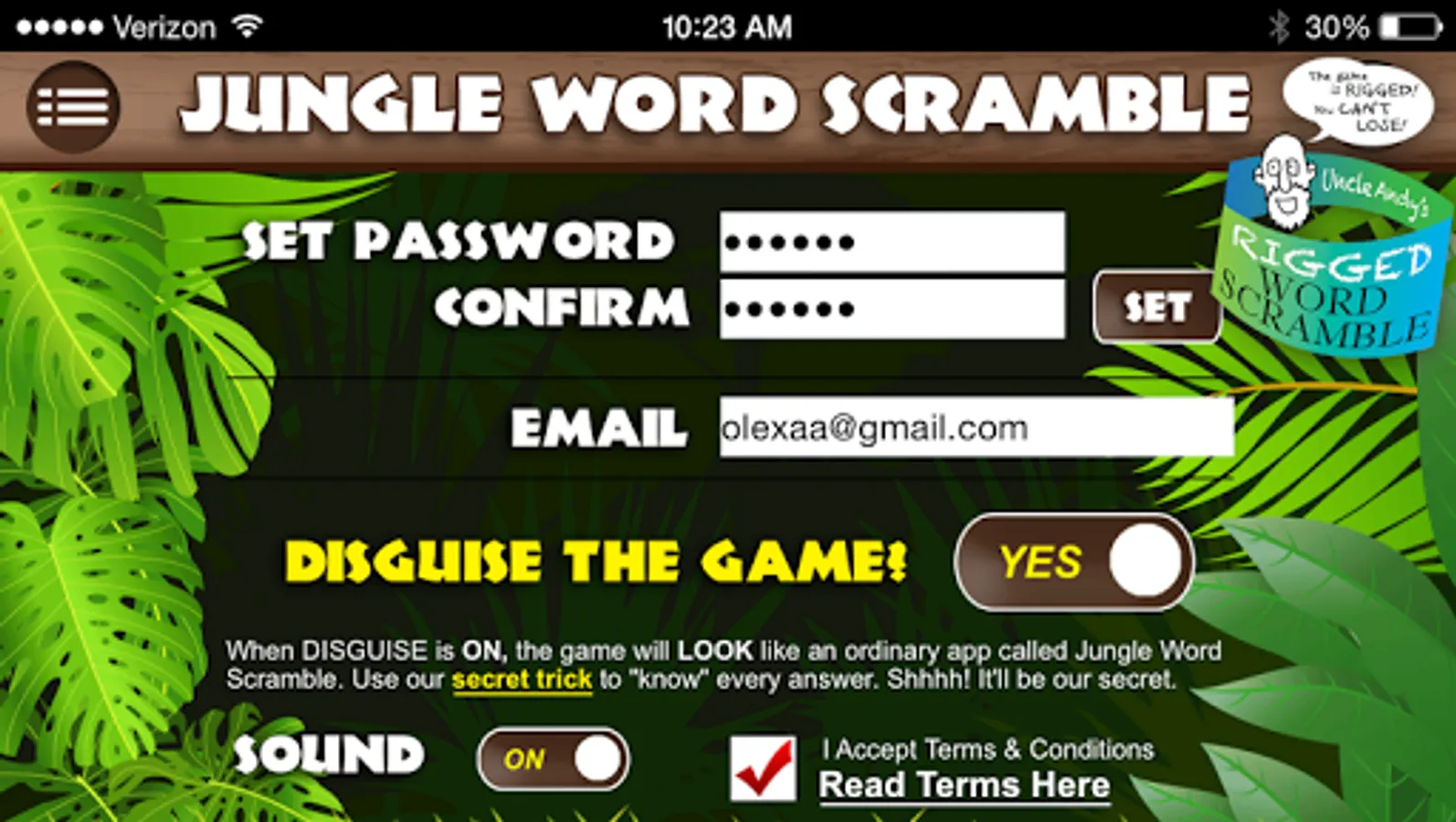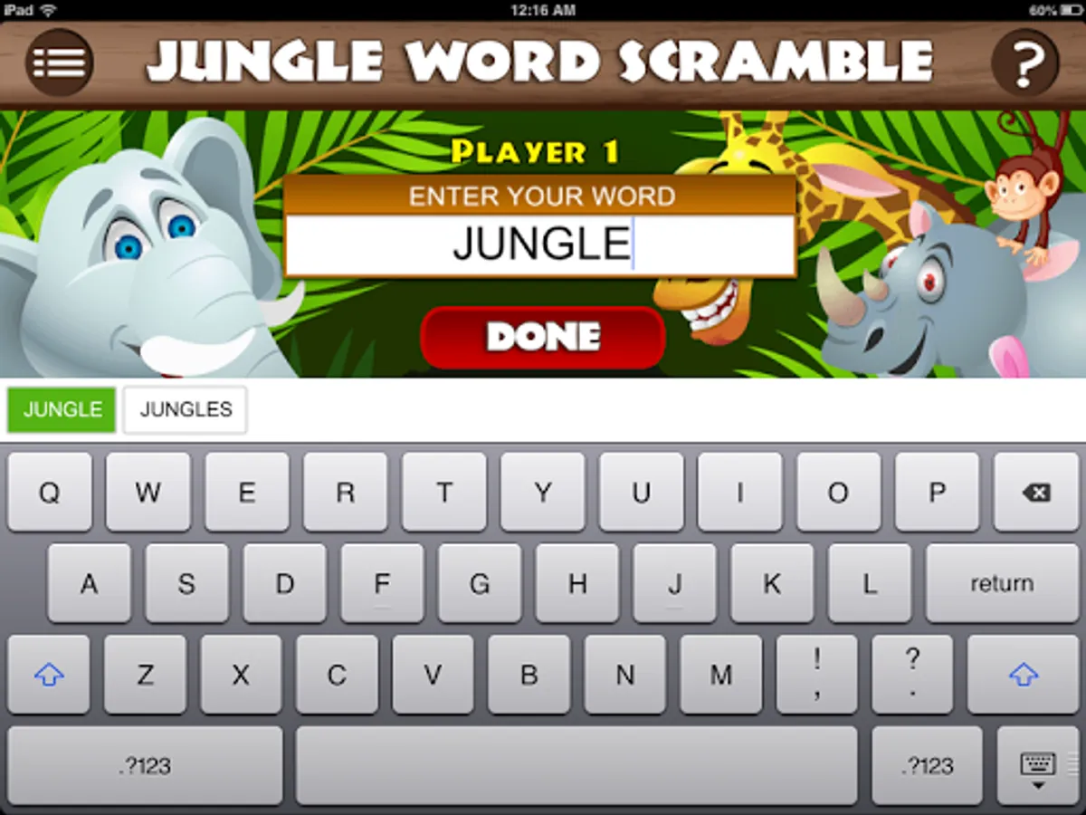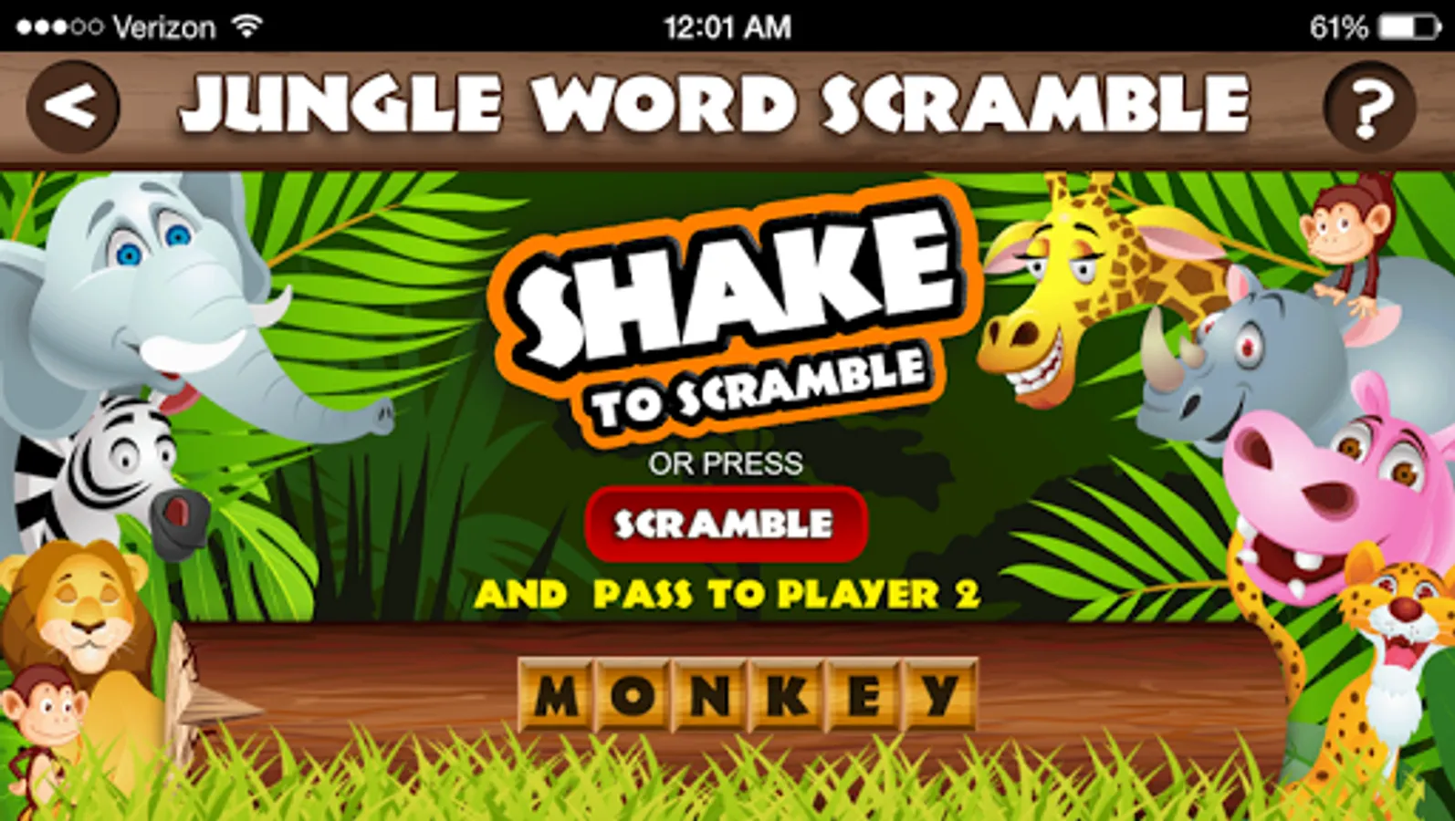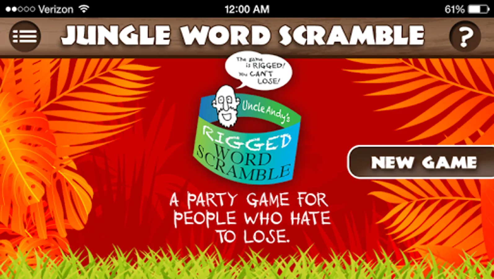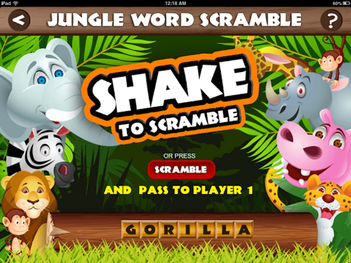 The app will transform, like magic, into an ordinary-looking trivia quiz called JUNGLE WORD SCRAMBLE. It will even appear as "Jungle Word Scramble" on your menu screen.