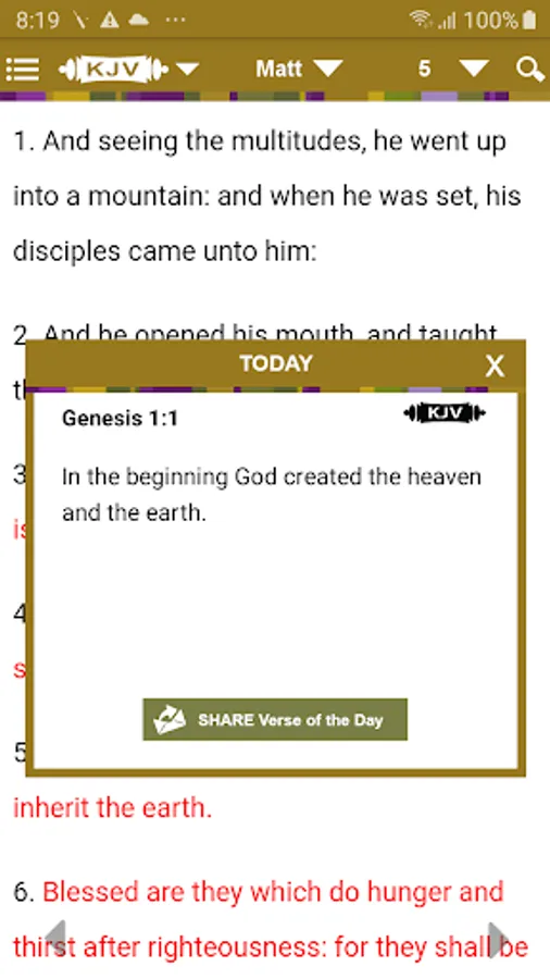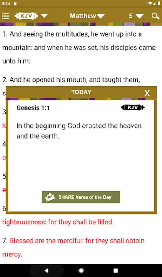 • Verse of the Day: each day a new verse is given and is easy to go to chapter, and share via Facebook, Twitter, text message and email