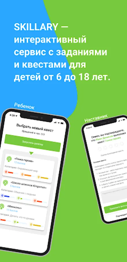 SKILLARY is an app for kids ages 6 to 12 with tasks that take place in the real world. More than 30 areas of tasks from creative to sports. Courses on professions, selections of games. The child develops skills and personality traits, gains experience and learns to spend his free time outside the gadget.