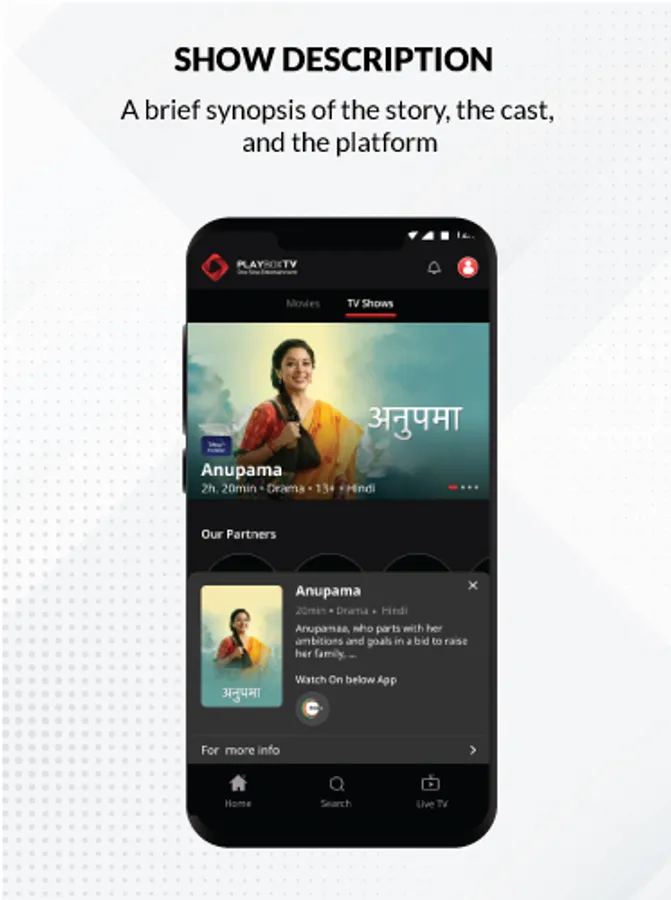 PlayboxTV is a super OTT aggregator application that enhances a customers experience by listing Movies, Tv shows & web series from over 30+ OTT Apps with 350+ Channels across 13+ Languages and reduces the number of apps a user must access by providing a one stop solution for all your entertainment.