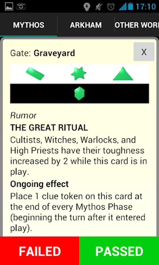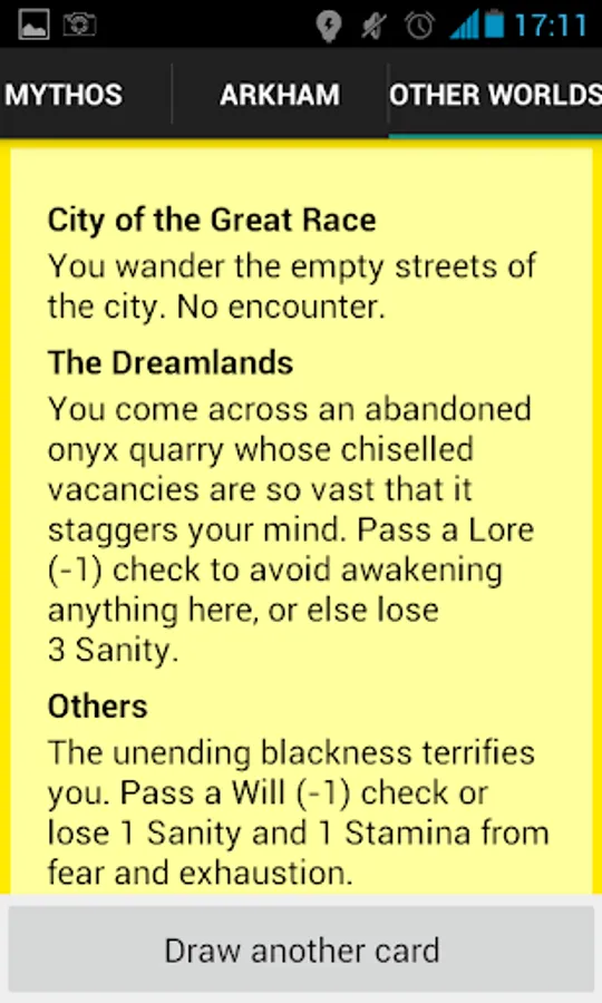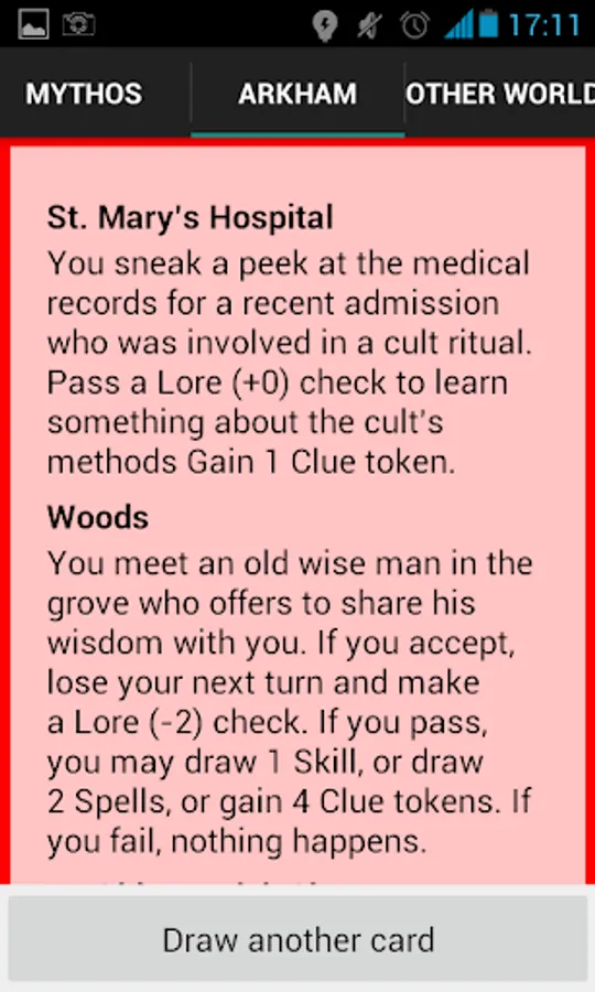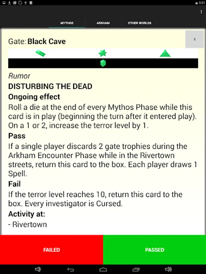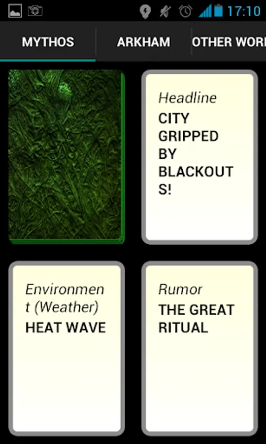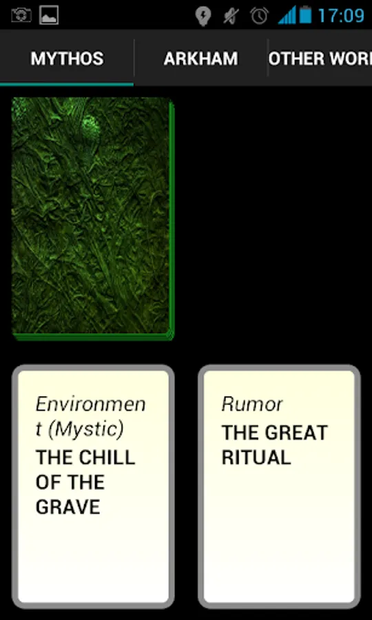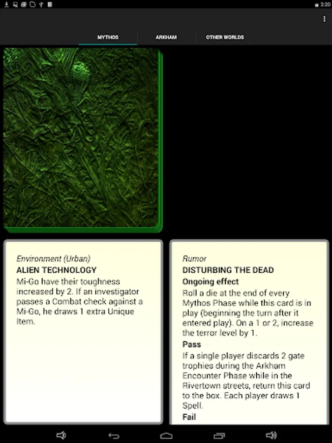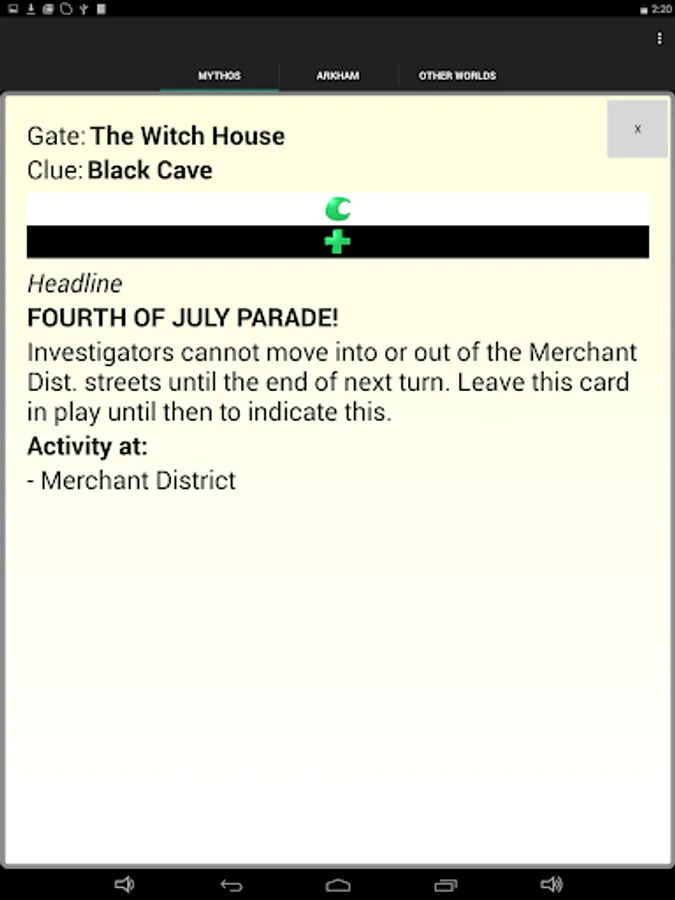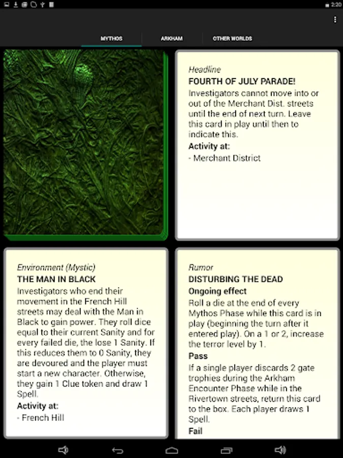 Arkham Decks replaces the physical decks of Mythos, Arkham encounters and Other Worlds encounters, doing for the players some bothersome tasks like shuffling, drawing the encounters card of the apropriate color, etc.