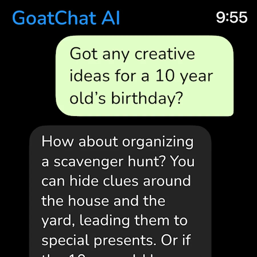 GoatChat makes it easy to stay on top of important tasks. Whether you want advice from ChatGPT, discuss the news using the power of Chat GPT, or plan trips based on ChatGPT, GoatChat has you covered.