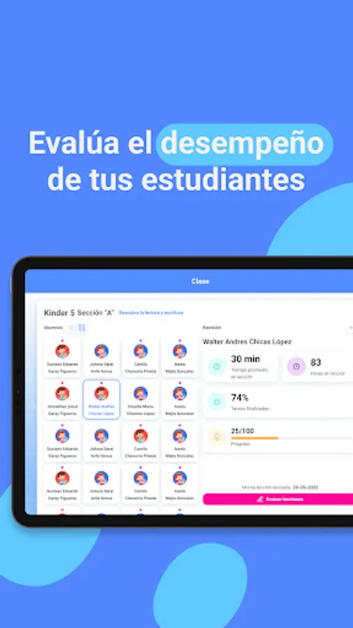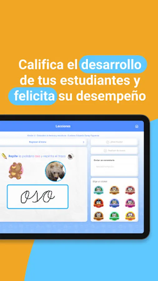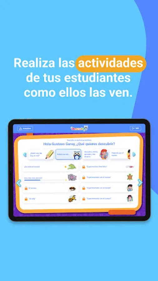 Evaluate and work with your students in Descubro's line of interactive books. Where you can evaluate the performance of your students, add your students to their corresponding classes with a simple code and keep up to date with their progress.