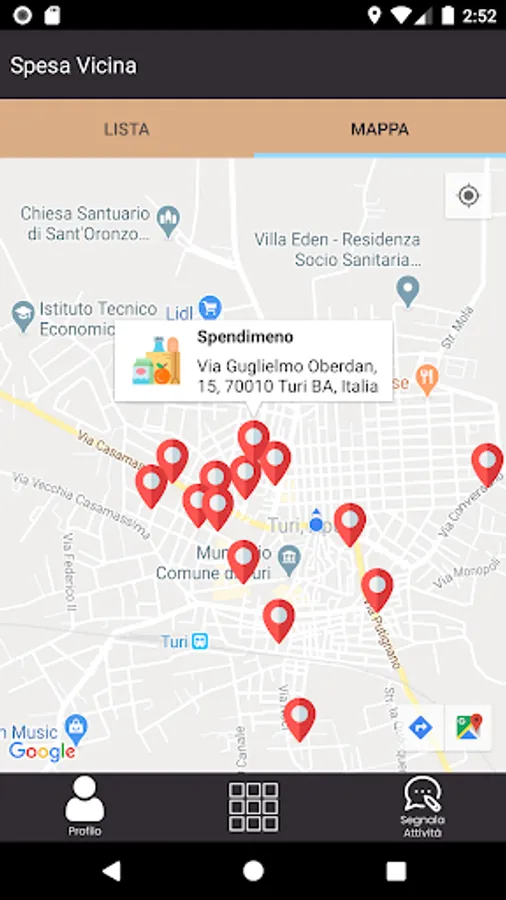 The app has two views, one on a list ordered according to your proximity to the shop and the other on the map, always focused on your position, so you can shop more efficiently.
