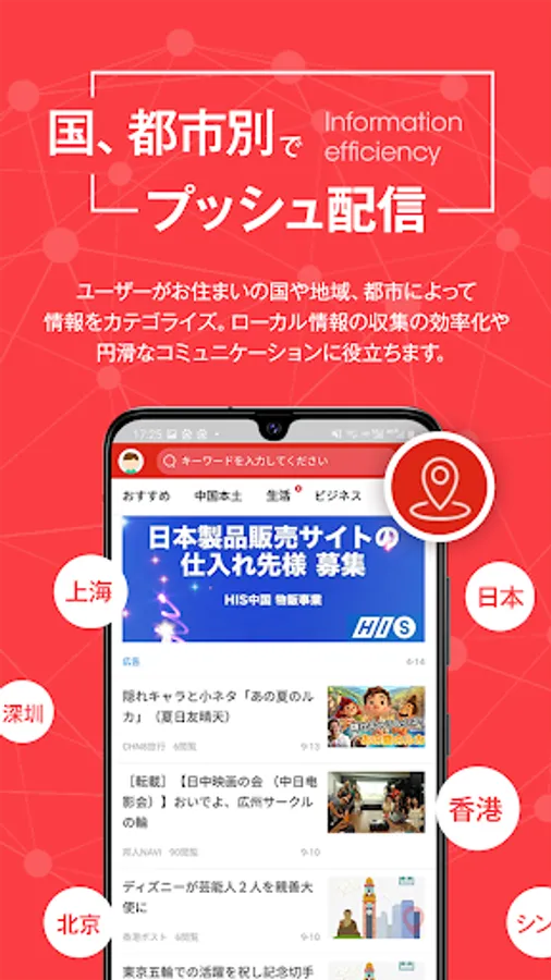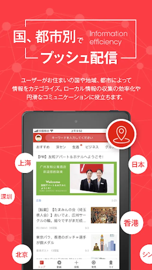 Categorize information by country, region, or city where users live. It is useful for efficient collection of local information and smooth communication. (* Limited to mainland China as of 2021)