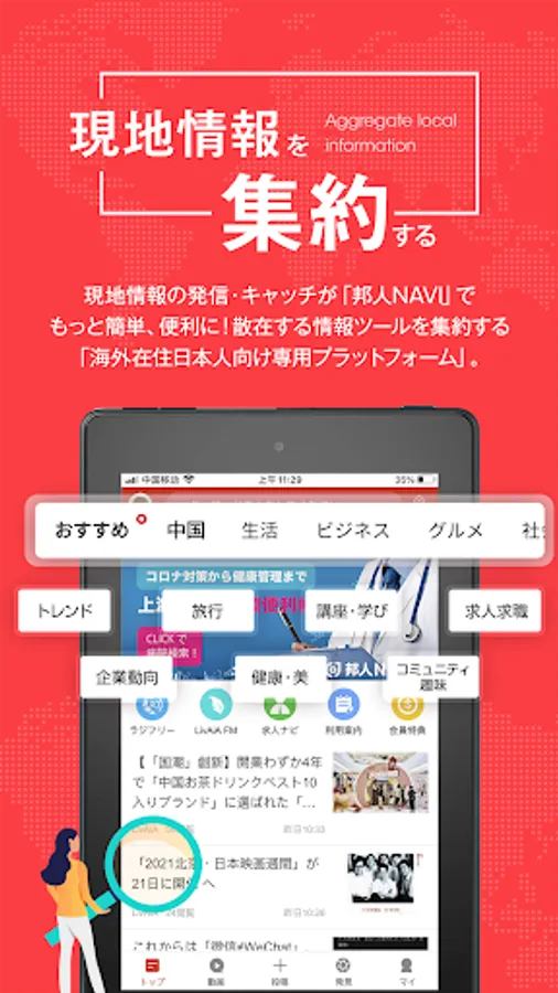 Sending and catching local information in each region of China is easier and more convenient with "Japanese NAVI"! A local information platform for Japanese living in China that aggregates scattered information tools! Equipped with a "discovery" function that anyone can participate in! Through videos, images, and tweets, you can connect with people who share your interests and friends in your hometown and alumni, and enjoy exchanges across countries, cities, and regions!