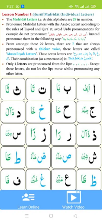 In this app you can learn compete Tajveed rules with 22 lessons so you can start your learning with from basic to advance after you recite the Holy Quran with correct Mukharij and pronunciation also with video lectures you watch to learn and touchable letters kids Easy to learn haroof mufridat 29 letters of Tahaji Harakaat tanveen haroof leen and answer questions start learn today.