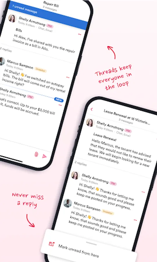Ailo's chat breaks your conversations into easy-to-follow threads, so you can stop wasting time digging around in emails or old text messages. With message notifications, the ability to mark-as-unread, and access for the whole team - you'll never skip a beat.