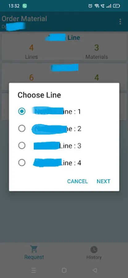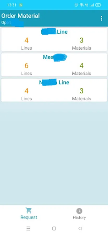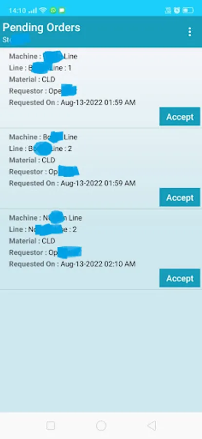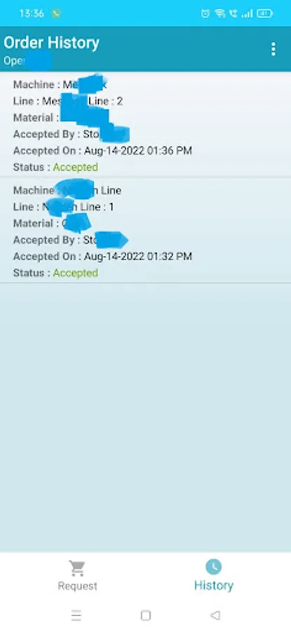 App allow Operator to send Requisition Request to Store Person. When the Operation submit the requisition request Machine Operator Select the Machine , Line & the Material. The new request reflects in the Store Person Login. Once the Store Person Accept the order from the Pending Order section, Operation can check the acceptation in the Order History Section.