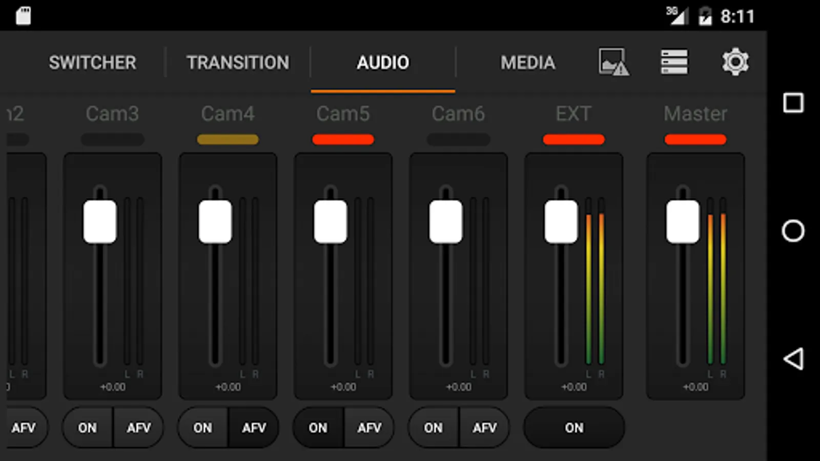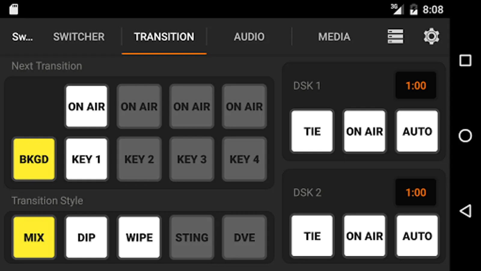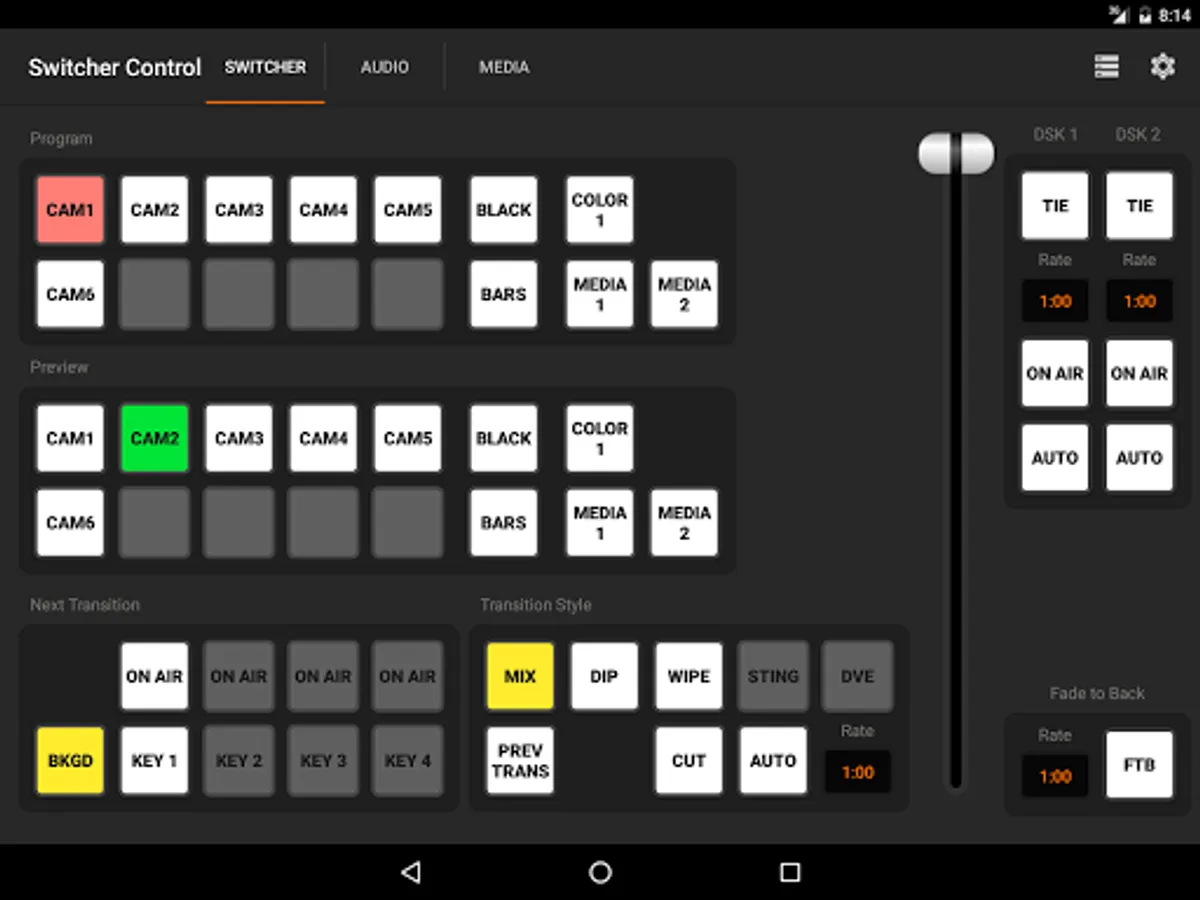 - Transition Control: Change of Program and Preview, Transitions, Fader and etc.