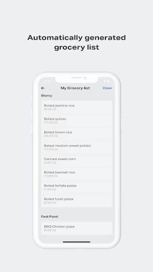 - Grocery list creation. You can automatically generate a complete list of items you need to purchase in order to follow the meal plan for a period of your choosing.